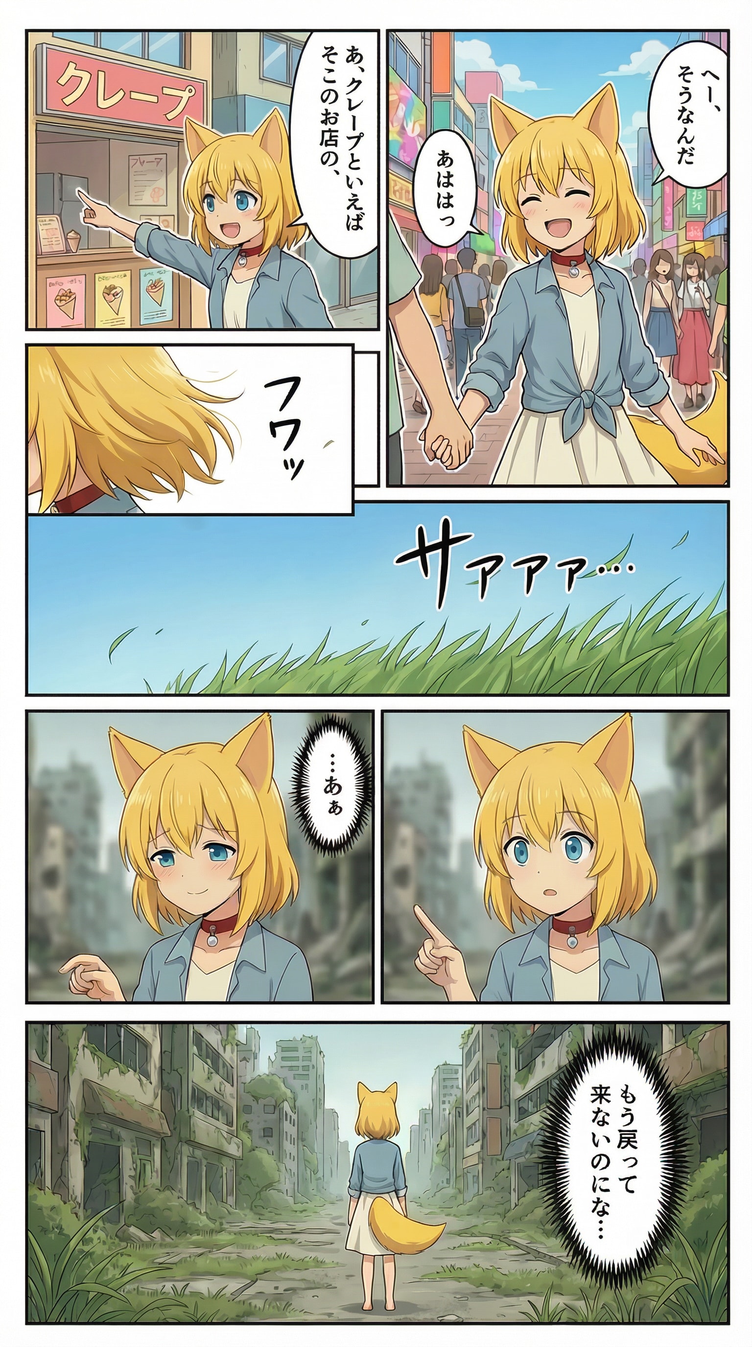 休日で賑わう街中を大切な人と手を繋いで歩きながら他愛ない話題に花を咲かせていたその時ふわりと髪と尻尾をなでる風に誘われるようにまぶたをひとつ瞬かせた途端白昼夢から覚めたみたいに街のざわめきがぷっつりと途絶え繋いでいたはずの手はどこにもなく朽ちていく世界にただ一人残された現実を思い出し胸をえぐるような孤独とあの日確かに感じた温もりの両方を抱きしめるように寂しく微笑むキツネ