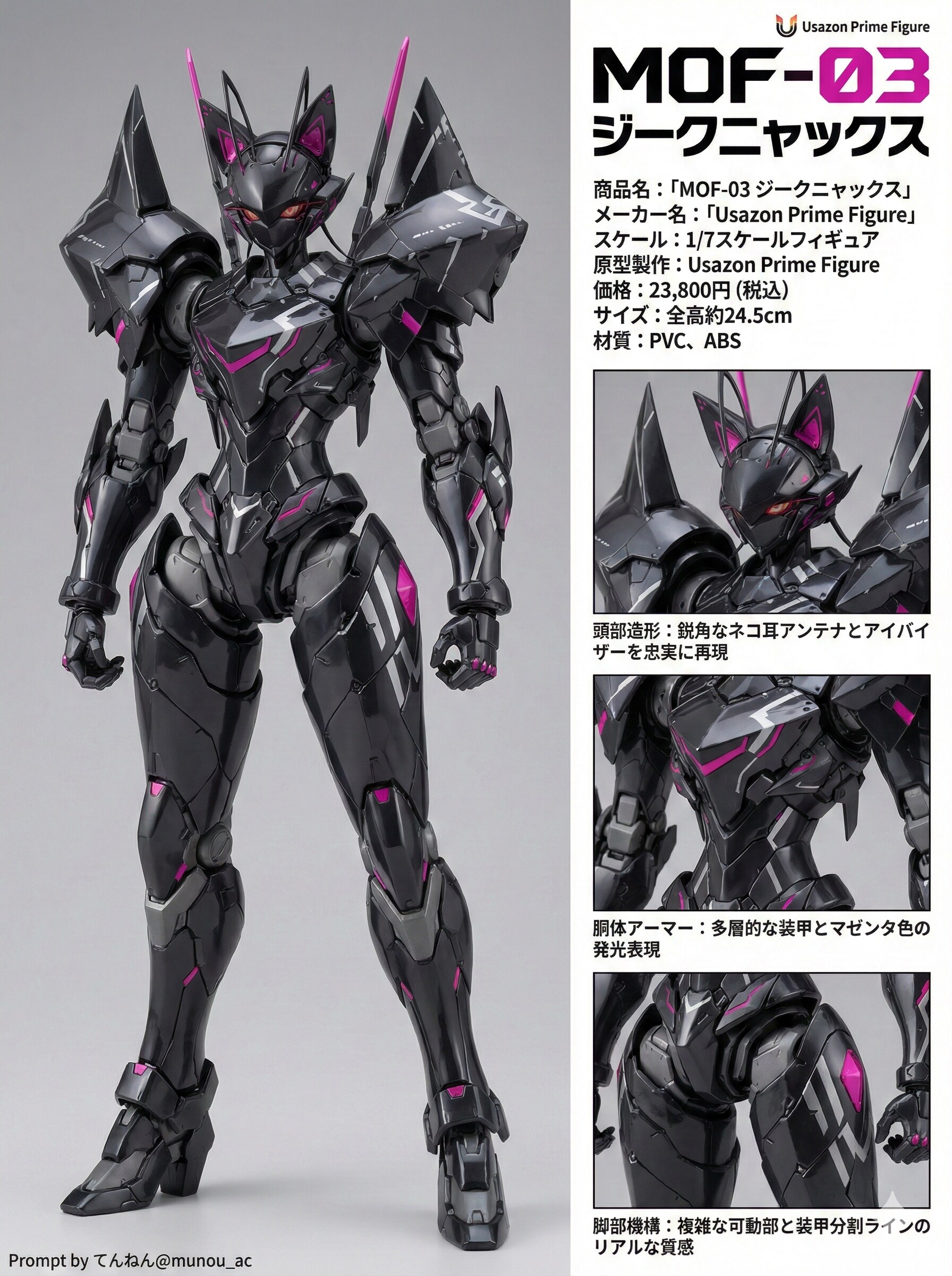 鋭角的な猫耳アンテナ、しなやかなフォルムはまさに高機動・長距離巡航型。猫の獣人族のみ操縦可能、黒と紫をまとい、夜を疾走する鋼鉄の旅する黒猫を完全再現! ニャンと背面部に折り畳まれ格納されている太陽エネルギー集光パネルも拡大可能です。