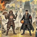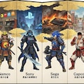 ゲームメーカーの歴史について語るYoutube動画を見ていて三国志とか戦国時代の国の建国、滅亡の様子になぞらえて物語っぽくなってるなあと思ったので知名度のあるメーカーをいくつか擬人化してって頼んだら絵巻物に描かれてそうな感じになっちゃいました。