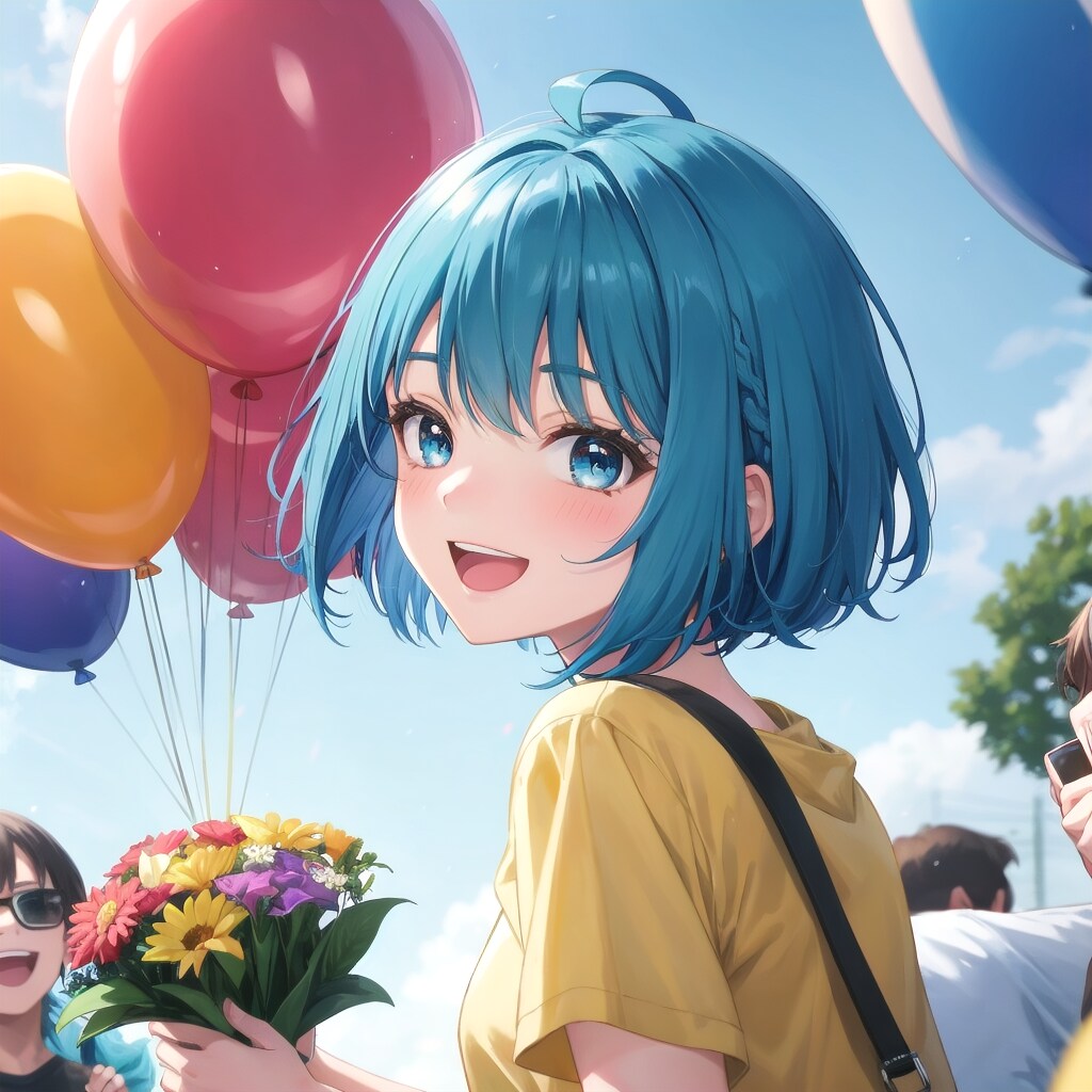 青髪ボブ子ちゃんがトレンディなカジュアル服で、にぎやかな屋外イベント会場で運営者に大きな花束を笑顔で手渡している、背景にバルーンが舞う明るく楽しいシーン。