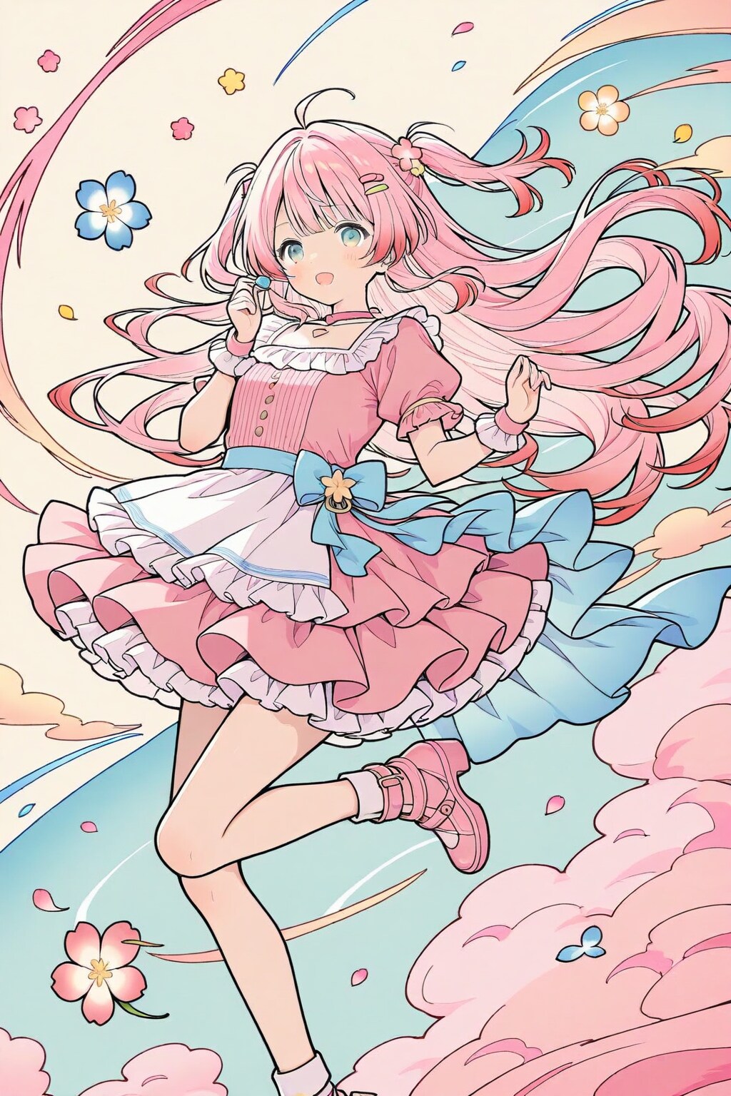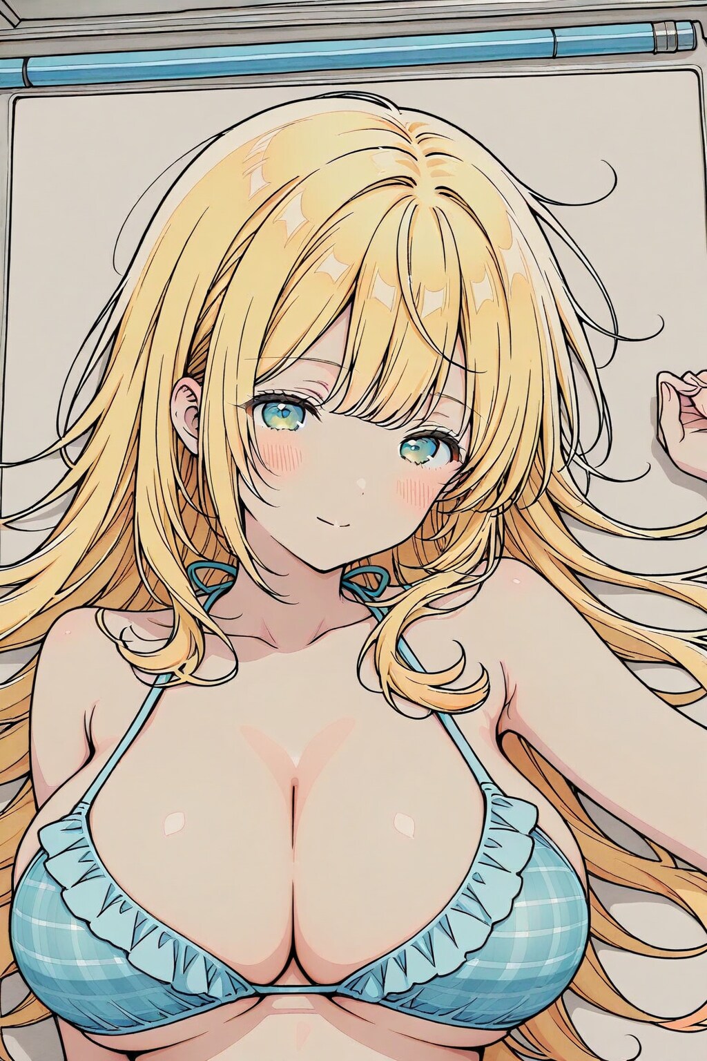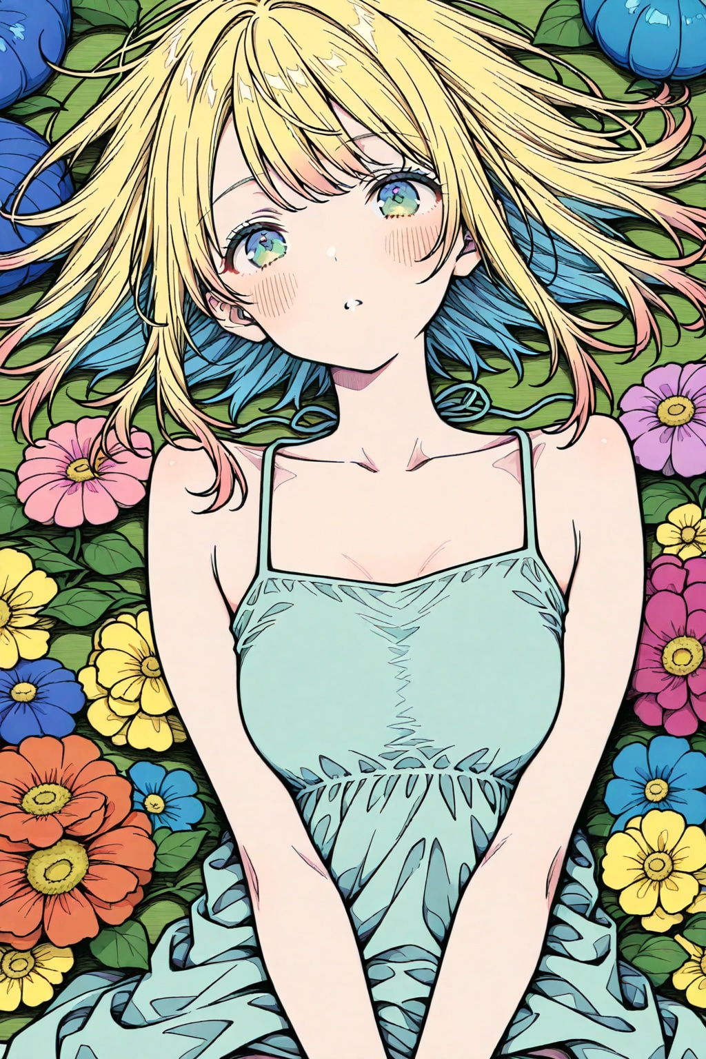 pastel anime art paper, inner blue, innocent, cute dear lady, lying, leaf, colorful background, underwear dress,