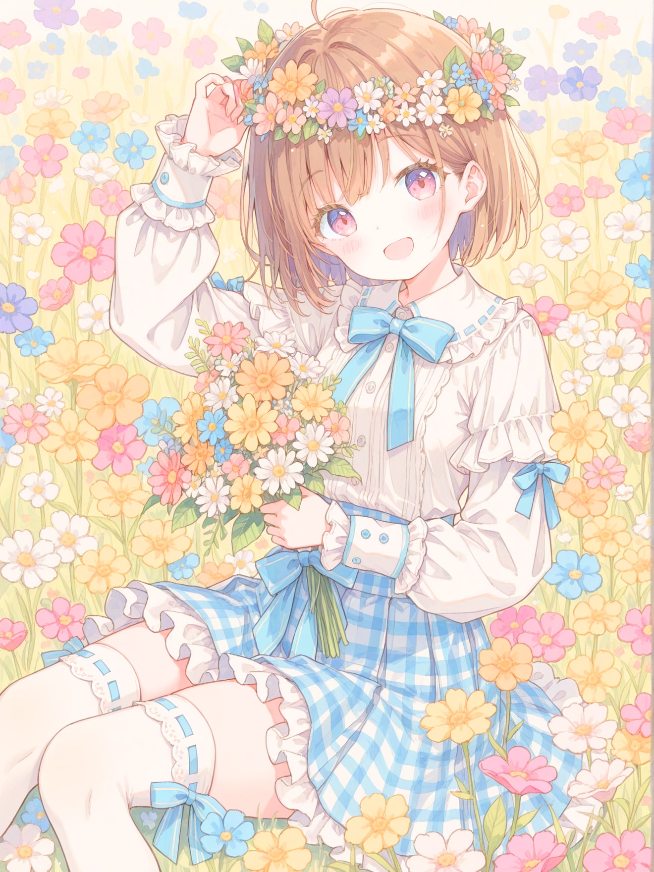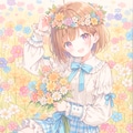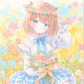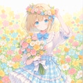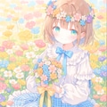パステルカラーの花畑で手作りの花冠をかぶった女の子を作ってみました