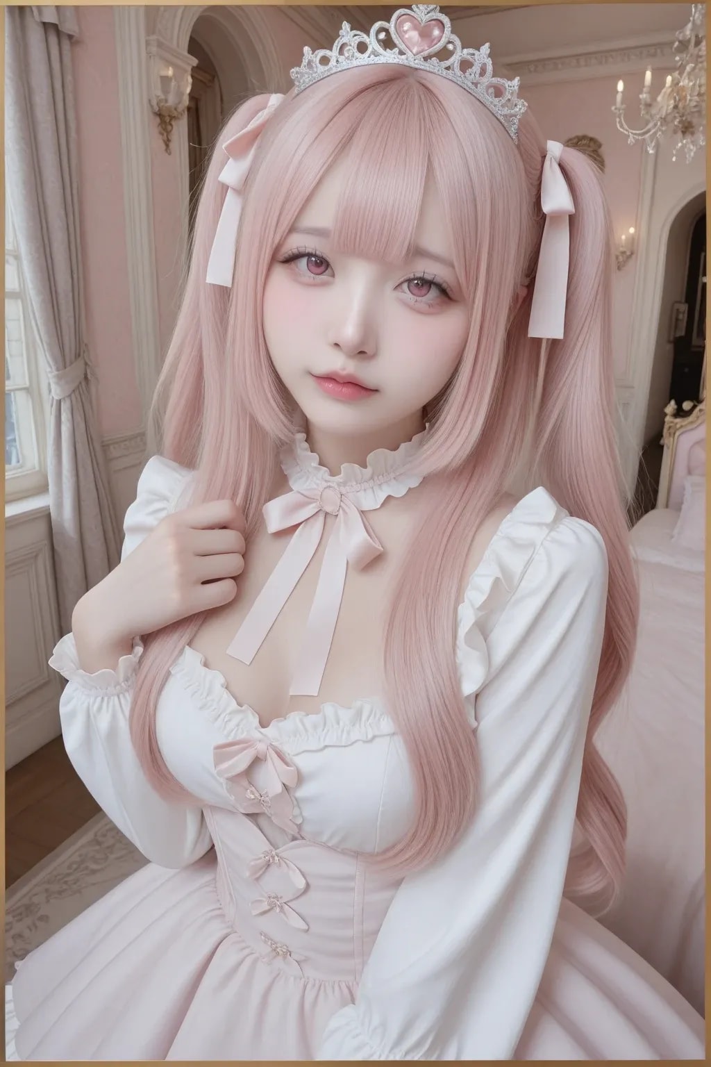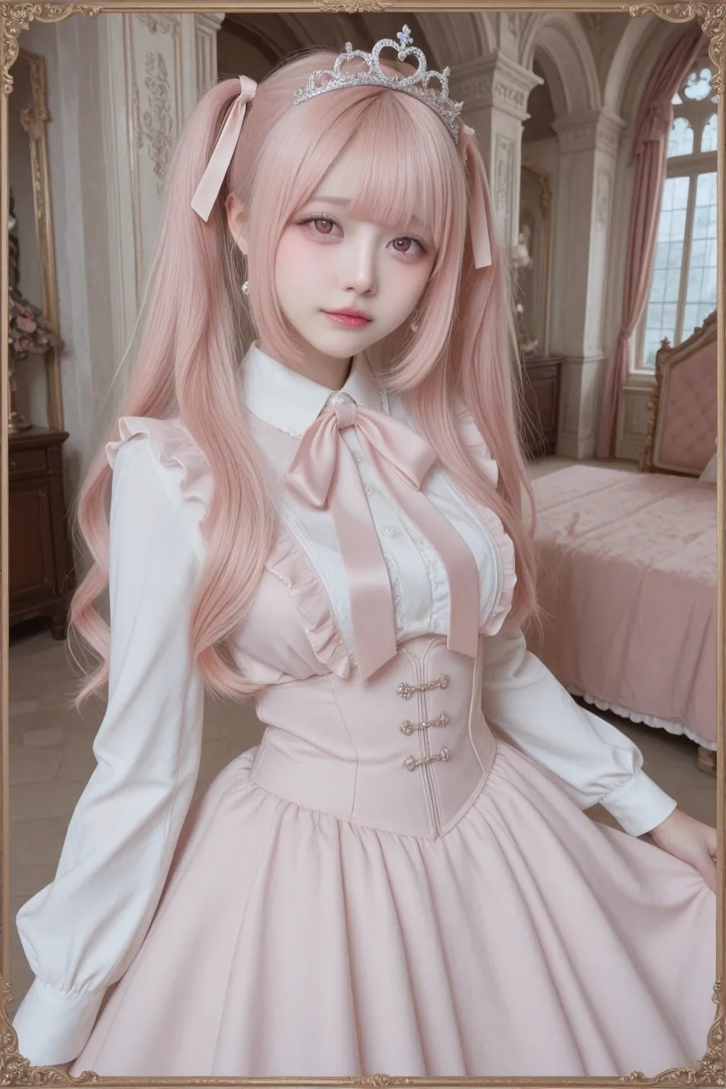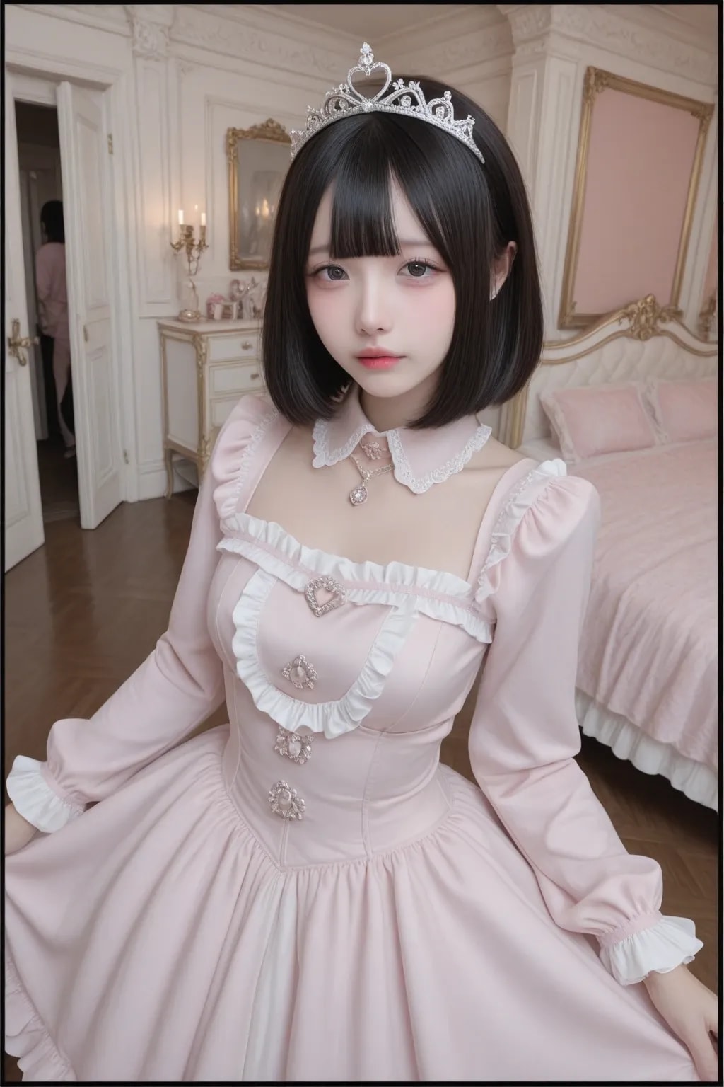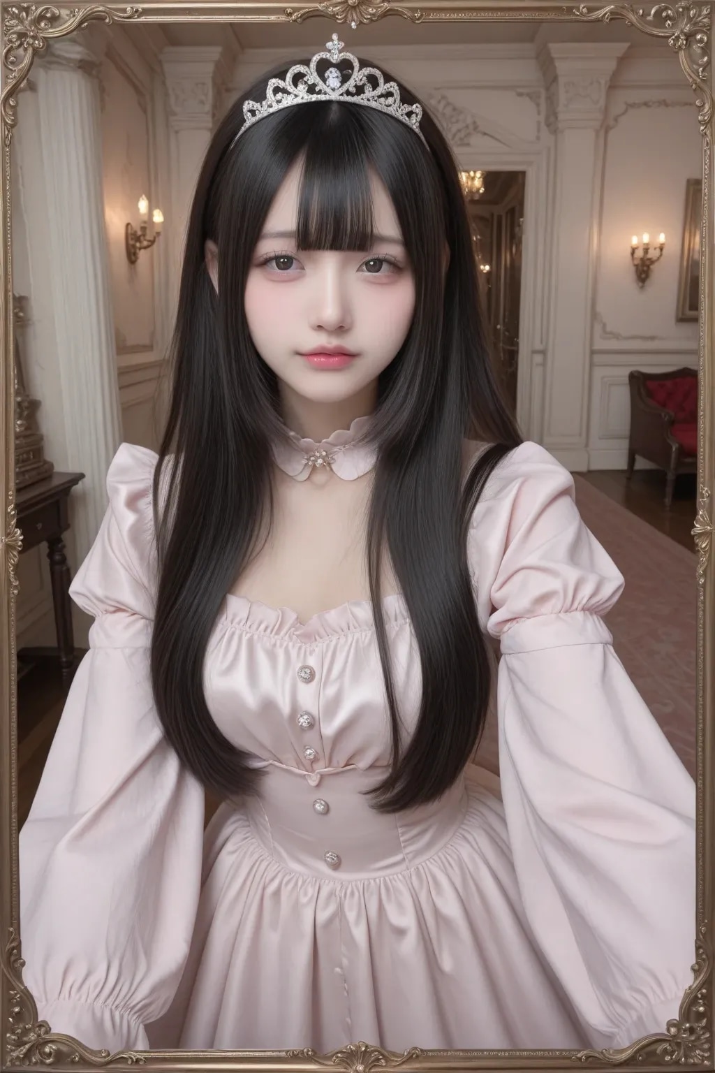 jf000, jiraikei_fashion, jiraikei_face, 最高傑作, 高画質, 高解像度, ハイクオリティ, 詳細なディテール, 地雷系, メンヘラ, ウェービーハーフツインヘア, 黒髪, 姫カット, ティアラ, プリンセスドレス, ピンク, フリル, フリフリ, お城の中の豪華な部屋