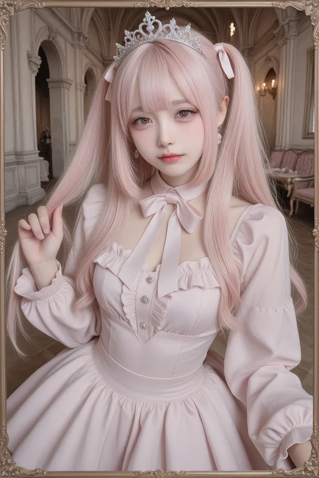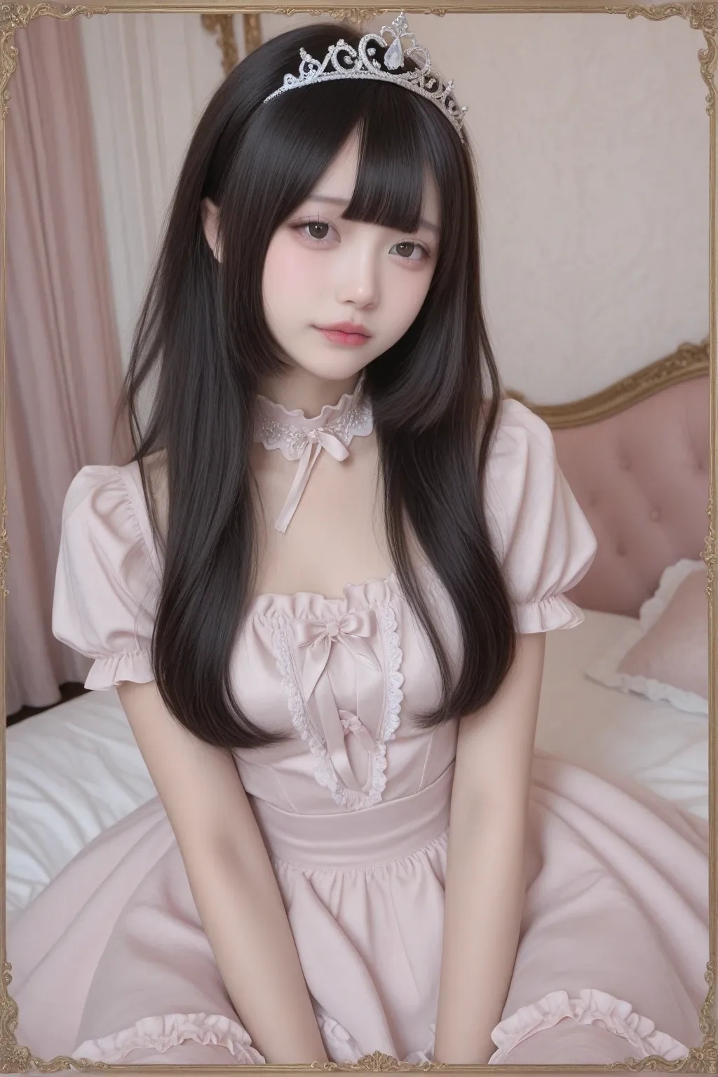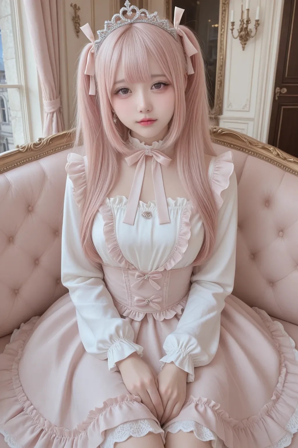 jf000, jiraikei_fashion, jiraikei_face, 最高傑作, 高画質, 高解像度, ハイクオリティ, 詳細なディテール, 地雷系, メンヘラ, ウェービーハーフツインヘア, 黒髪, 姫カット, ティアラ, プリンセスドレス, ピンク, フリル, フリフリ, お城の中の豪華な部屋