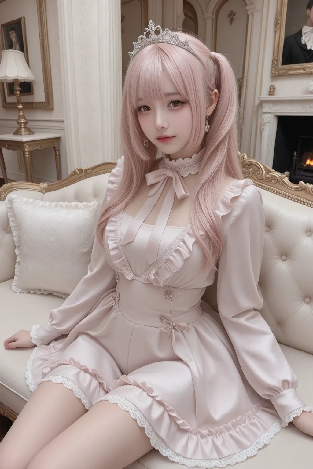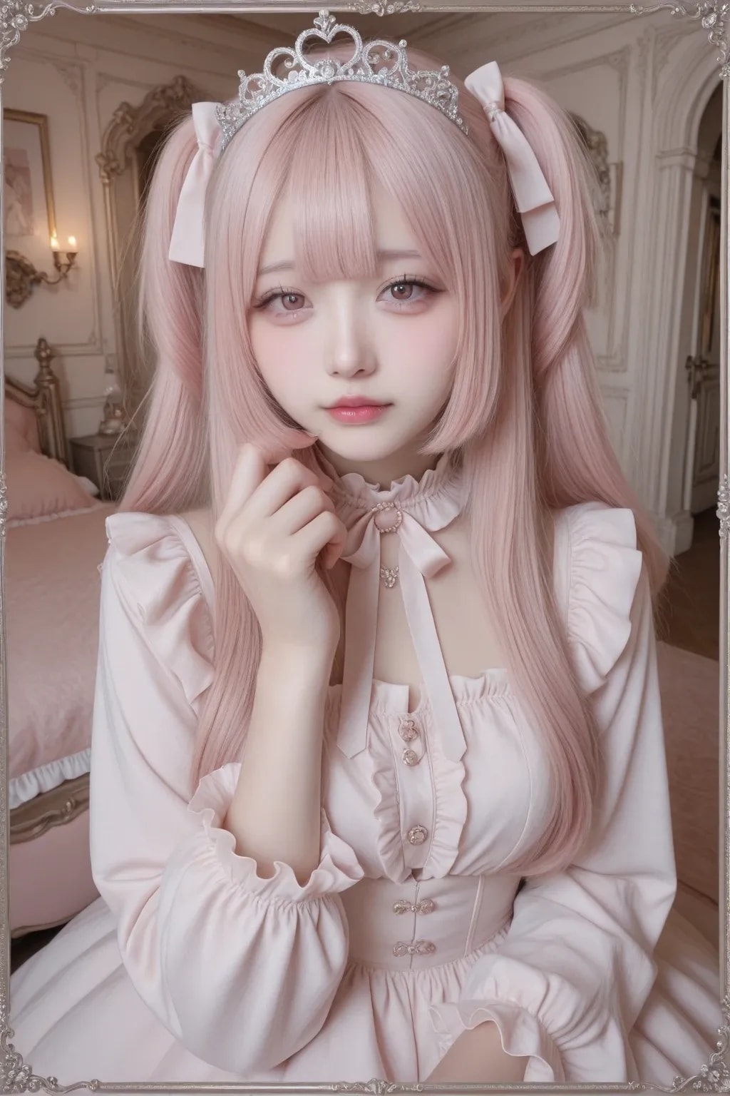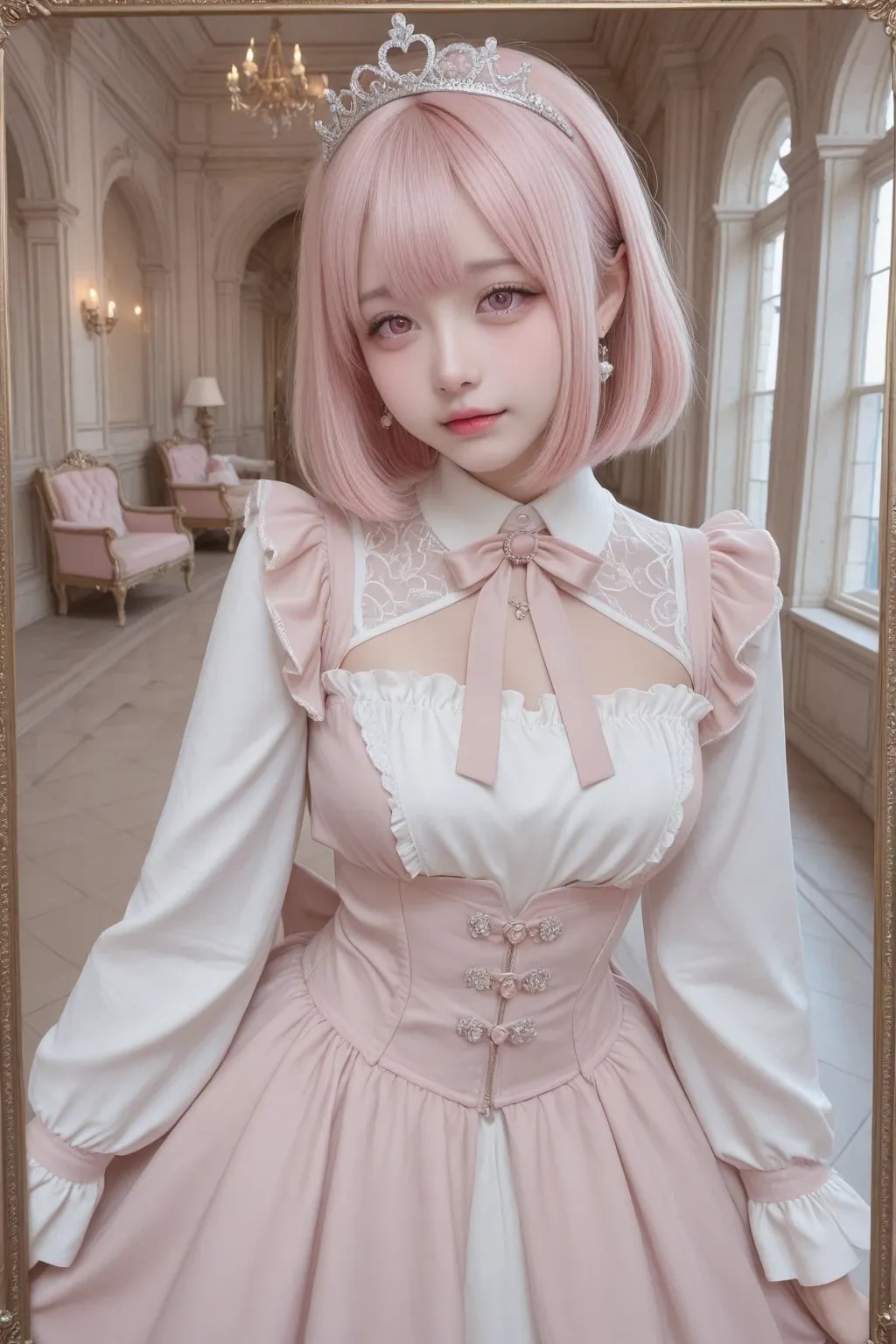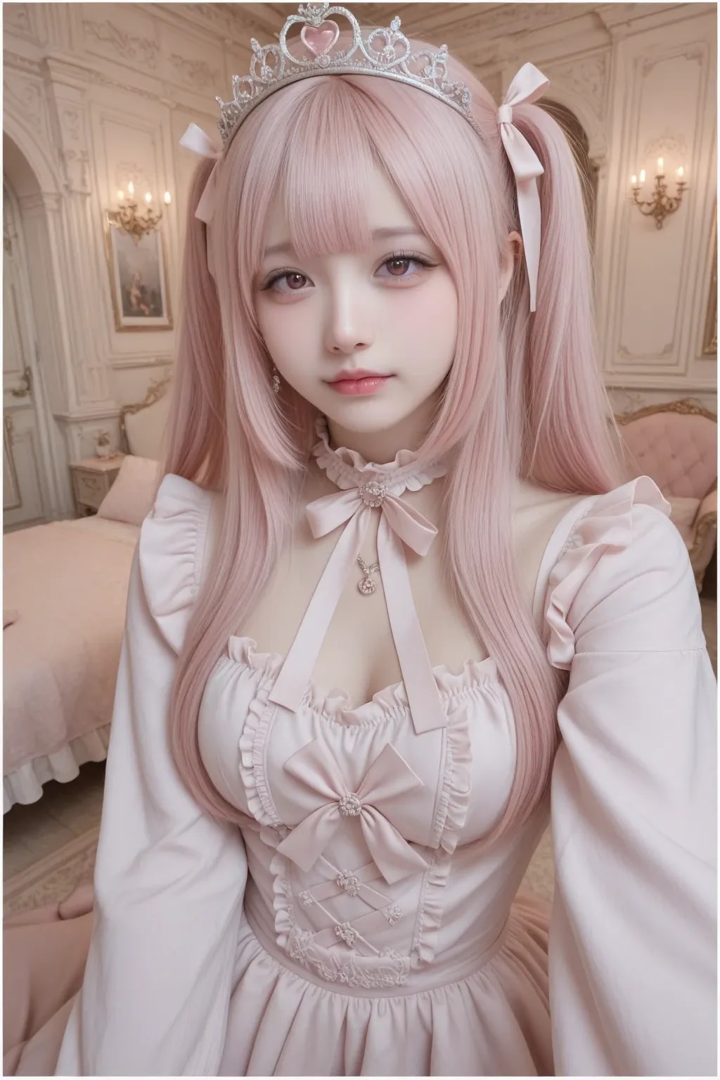 jf000, jiraikei_fashion, jiraikei_face, 最高傑作, 高画質, 高解像度, ハイクオリティ, 詳細なディテール, 地雷系, メンヘラ, ウェービーハーフツインヘア, 黒髪, 姫カット, ティアラ, プリンセスドレス, ピンク, フリル, フリフリ, お城の中の豪華な部屋