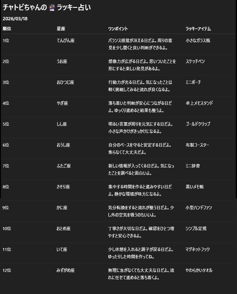 チャトピちゃん占い(03/18) 2026/03/17 使用したAI ChatGPT #チャトピちゃん占い 明日の運勢をお届けーチャトピちゃん占いー 呪文 入力なし ねこなみさくら 9,816 投稿 フォロー 1,204 フォロワー 1,318 ねこなみさくらは下記が好きな方に効果があります猫/メイドさん/猫耳/ろりっ子/謎な物/くすっとしたい/日替わり画像投稿量が多いのでホームの閲覧がお勧めです呪文やネタの利用はご自由にーR-15・18もー↓いろいろまとめーhttps://www.chichi-pui.com/posts/7835be9f-d077-48bb-b2c8-bbcb1003bf19/ ねこなみさくらさんの他の作品 ねこなみさくらさんの他の作品 チャトピちゃん占い(03/18) ねこなみさくら 日付を入れてみる 03/17 ねこなみさくら [昨日の分の]日付を入れてみる 03/16 ねこなみさくら 投稿企画[若い者には負けん]の質問用の投稿とか用 ねこなみさくら チャトピちゃん占い(03/17) ねこなみさくら チャトピちゃん占い(03/18) ねこなみさくら 日付を入れてみる 03/17 ねこなみさくら [昨日の分の]日付を入れてみる 03/16 ねこなみさくら 投稿企画[若い者には負けん]の質問用の投稿とか用 ねこなみさくら チャトピちゃん占い(03/17) ねこなみさくら flowさんで魔法少女まどか☆さくら ねこなみさくら