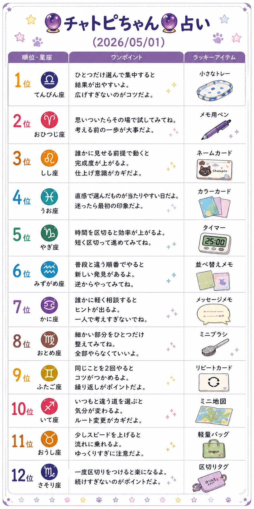 チャトピちゃん占い(05/01) 2026/04/30 使用したAI ChatGPT #チャトピちゃん占い 呪文 入力なし ねこなみさくら 10,403 投稿 フォロー 1,265 フォロワー 1,382 ねこなみさくらは下記が好きな方に効果があります猫/メイドさん/猫耳/ろりっ子/謎な物/くすっとしたい/日替わり画像投稿量が多いのでホームの閲覧がお勧めです呪文やネタの利用はご自由にーR-15・18もー↓いろいろまとめーhttps://www.chichi-pui.com/posts/7835be9f-d077-48bb-b2c8-bbcb1003bf19/ ねこなみさくらさんの他の作品 ねこなみさくらさんの他の作品 チャトピちゃん占い(05/01) ねこなみさくら きょうのオムライス(04/30) ねこなみさくら きょうの取引 ねこなみさくら バイオハザード+何か ねこなみさくら 日付を入れてみる 04/30 ねこなみさくら チャトピちゃん占い(05/01) ねこなみさくら きょうのオムライス(04/30) ねこなみさくら きょうの取引 ねこなみさくら バイオハザード+何か ねこなみさくら 日付を入れてみる 04/30 ねこなみさくら VEGAちゃん期間限定復帰! ねこなみさくら