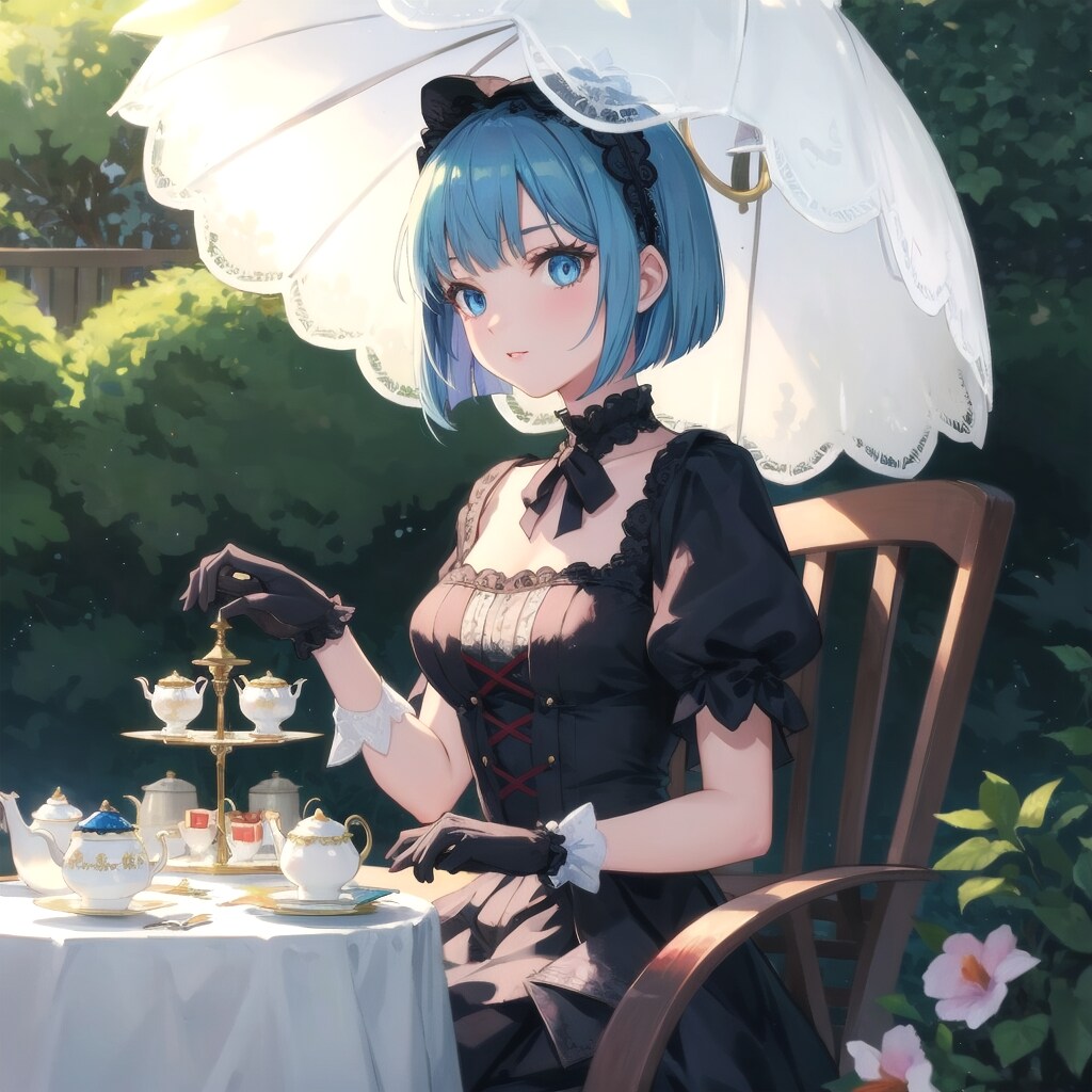 大学の帰り道、青髪ボブ子ちゃんはアンティークな庭園で開かれるクラシカルロリィタのティーパーティーに招かれました。レースの手袋をつけて紅茶を一口、優雅な時の流れを楽しみます。小さな木漏れ日が、彼女の青い瞳にきらめきを加えていました。