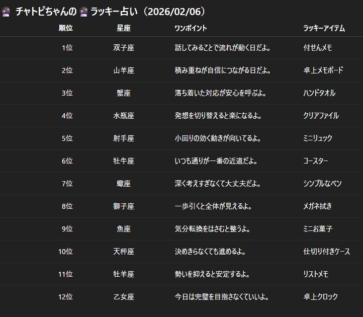 チャトピちゃん占い(02/06) 2026/02/05 使用したAI ChatGPT #チャトピちゃん占い 明日の運勢をお届けーチャトピちゃん占いー 呪文 入力なし ねこなみさくら 9,764 投稿 フォロー 1,203 フォロワー 1,315 ねこなみさくらは下記が好きな方に効果があります猫/メイドさん/猫耳/ろりっ子/謎な物/くすっとしたい/日替わり画像投稿量が多いのでホームの閲覧がお勧めです呪文やネタの利用はご自由にーR-15・18もー↓いろいろまとめーhttps://www.chichi-pui.com/posts/7835be9f-d077-48bb-b2c8-bbcb1003bf19/ ねこなみさくらさんの他の作品 ねこなみさくらさんの他の作品 てててー、てってててー(03/07) ねこなみさくら きょうのオムライス(03/06) ねこなみさくら てててー、てってててー(03/06) ねこなみさくら 銀英伝初打ちで結構出た記念 ねこなみさくら チャトピちゃん占い(03/06) ねこなみさくら てててー、てってててー(03/07) ねこなみさくら きょうのオムライス(03/06) ねこなみさくら てててー、てってててー(03/06) ねこなみさくら 銀英伝初打ちで結構出た記念 ねこなみさくら チャトピちゃん占い(03/06) ねこなみさくら きょうのオムライス(03/05) ねこなみさくら