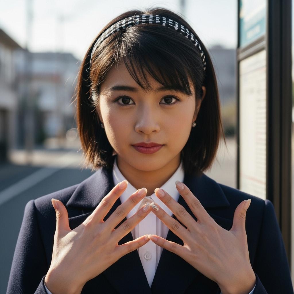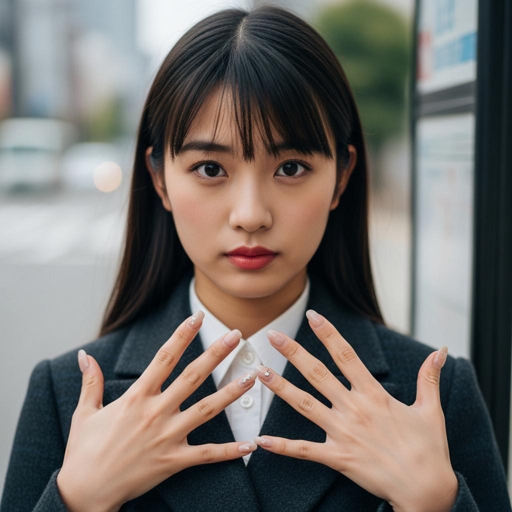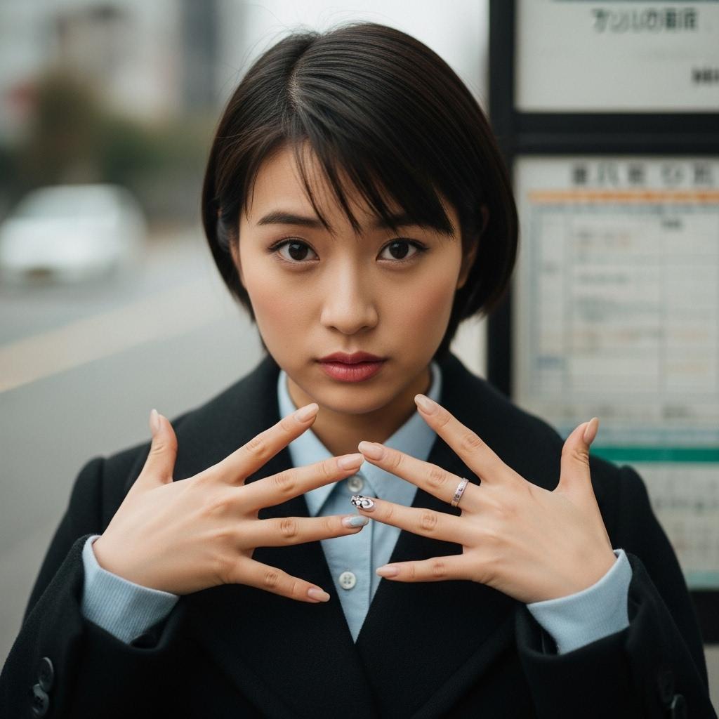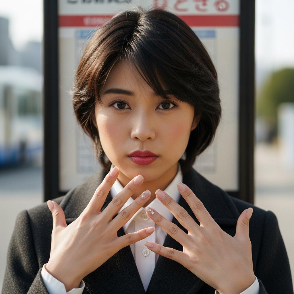 ネイルを見せる、バス停