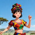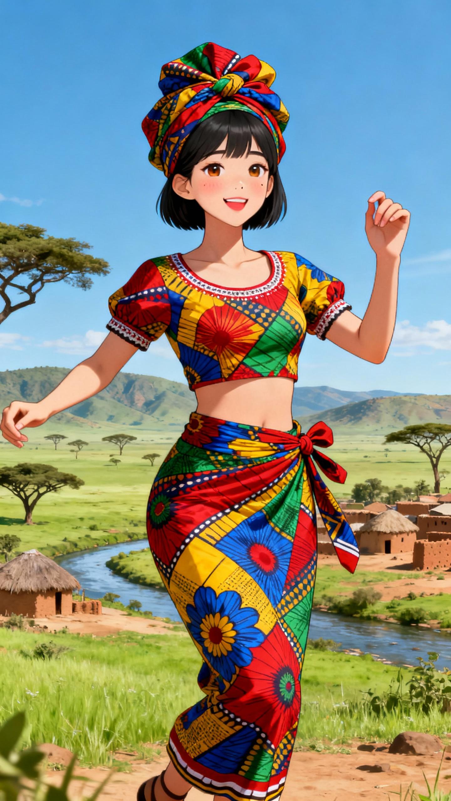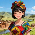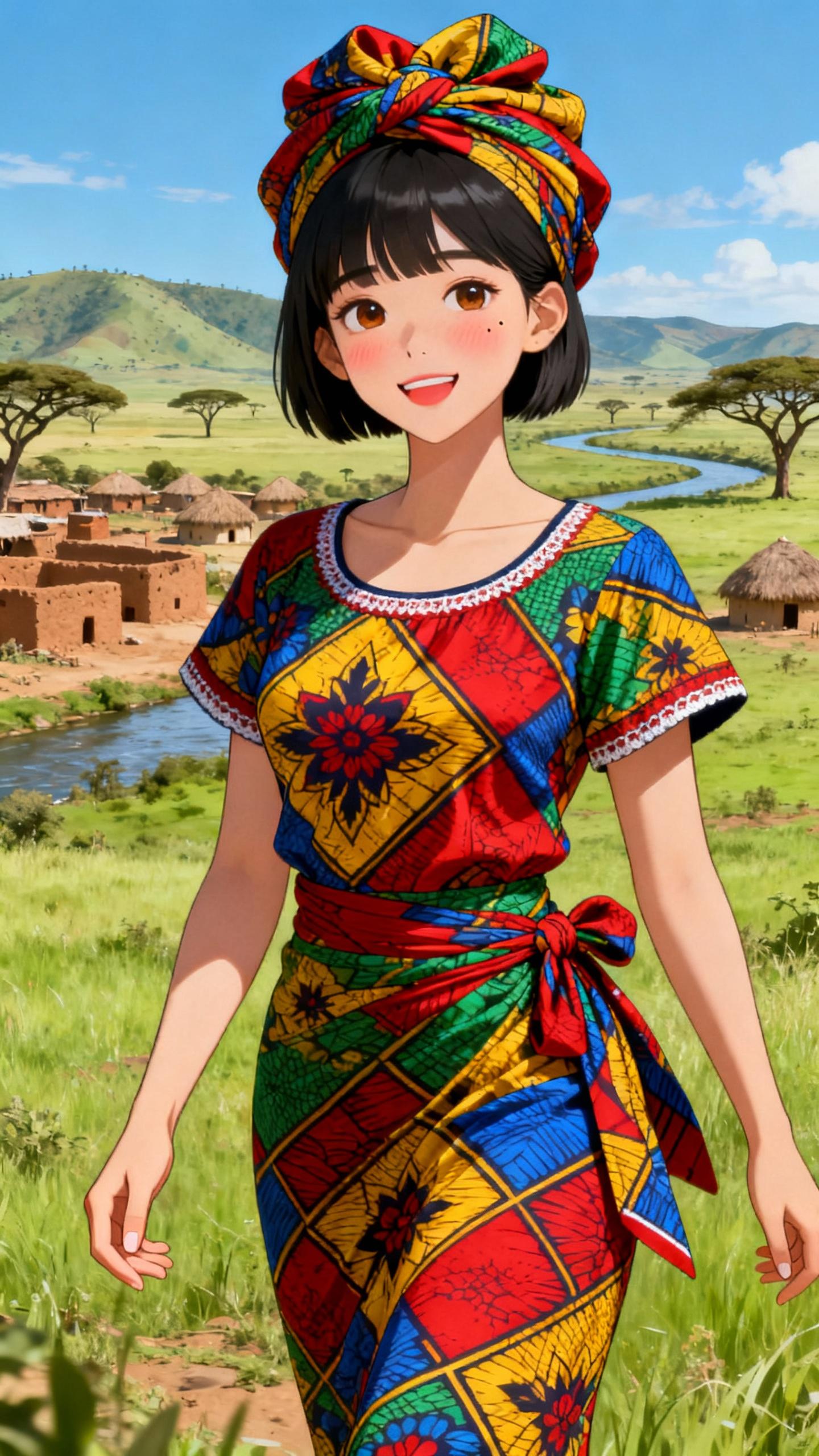 中央アフリカ共和国で広く着用される女性の民族衣装。鮮やかなワックスプリント生地を使用した、幾何学模様や花柄のカラフルなラップスカートと、短袖のフィット感のあるブラウスで構成。頭には同柄のヘッドラップを巻くことが一般的。軽量なコットン素材で、明るい色合いが特徴。