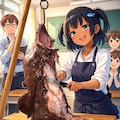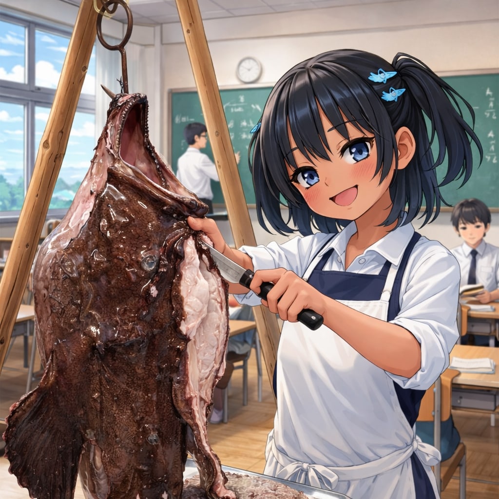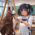 アンコウの吊るし切りをするこなつちゃん