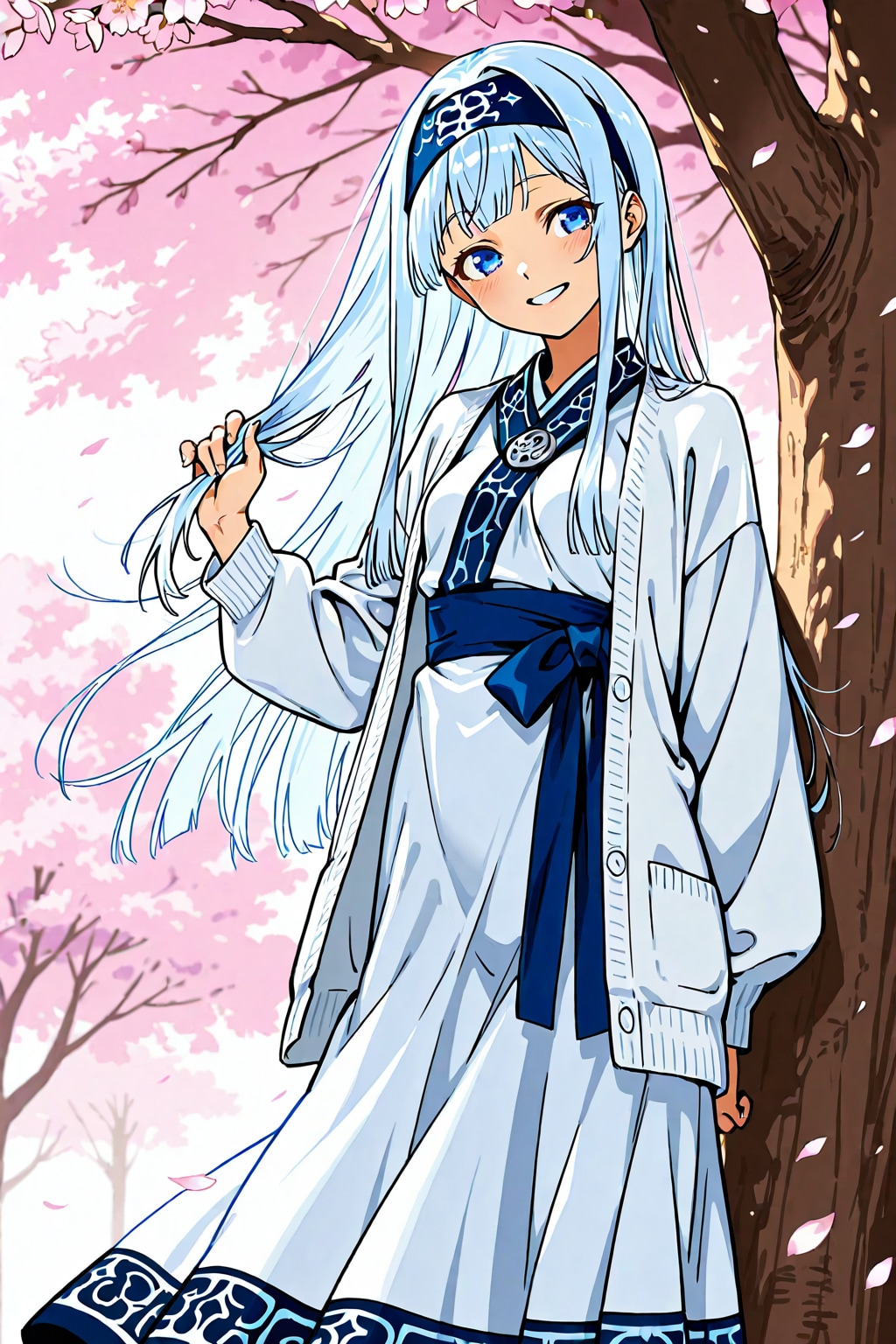 三つ編みを解いて清楚系をアピール。ただし、お気に入りのアイヌ系ヘアバンドは外しません。