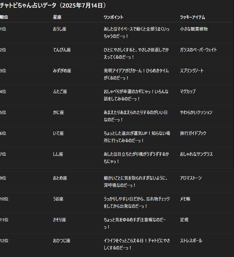 07/14のチャトピちゃん占い 2025/07/13 使用したAI ChatGPT #チャトピちゃん占い 明日の運勢をお昼ごろにお届けーチャトピちゃん占いー 呪文 入力なし ねこなみさくら 8,810 投稿 フォロー 1,034 フォロワー 1,135 ねこなみさくらは下記が好きな方に効果があります猫/メイドさん/猫耳/ろりっ子/謎な物/くすっとしたい/日替わり画像投稿量が多いのでホームの閲覧がお勧めです呪文やネタの利用はご自由にーR-15・18もー生成用?自作診断メーカーまとめhttps://www.chichi-pui.com/posts/824ee8bb-e261-4f91-bb51-afb6142bc12b/ ねこなみさくらさんの他の作品 ねこなみさくらさんの他の作品 たてよみした ねこなみさくら チャトピちゃん占い(12/17) ねこなみさくら きょうのオムライス(12/16) ねこなみさくら てててー、てってててー(12/16) ねこなみさくら まだ売り切れ中 ねこなみさくら たてよみした ねこなみさくら チャトピちゃん占い(12/17) ねこなみさくら きょうのオムライス(12/16) ねこなみさくら てててー、てってててー(12/16) ねこなみさくら まだ売り切れ中 ねこなみさくら ほんとこうすればいいのになぁと ねこなみさくら