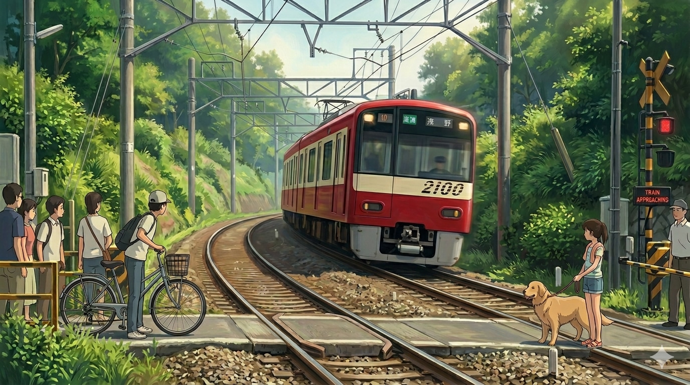 踏切事故撲滅、人を配置すると踏切内に入ってくる。ダメ絶対。ちちぷい生成といつものGeminiさんです。