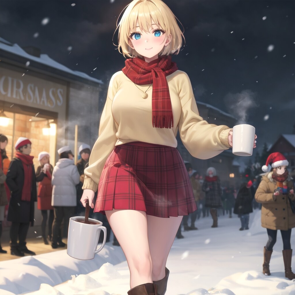 クリーム色のニットセーターと赤いチェック柄スカートを組み合わせたクリスマススタイル。曲線を引き立てるハイウエストデザインで、赤いマフラーとブーツが暖かさを加える。青髪ボブ子ちゃんの学校のアメリカ出身の英語教師は、ホットココアを手に、優雅な雰囲気で雪が降るランウェイを歩く。