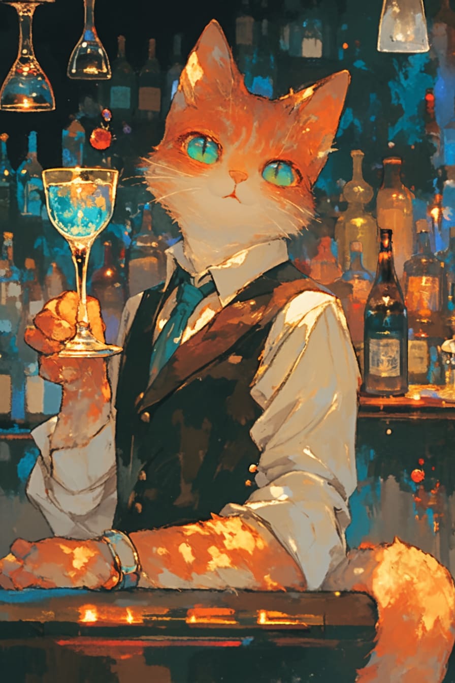 皆さん、こんにちは!今日はとっておきのバーにご案内しますね。カウンターに立つのは、なんと猫のバーテンダーさんなんです!鮮やかなカクテルグラスを傾ける姿が、とってもスマートでしょ?お洒落な雰囲気の中で、特別な一杯をどうぞ♪ きっと素敵な夜になりますよ!