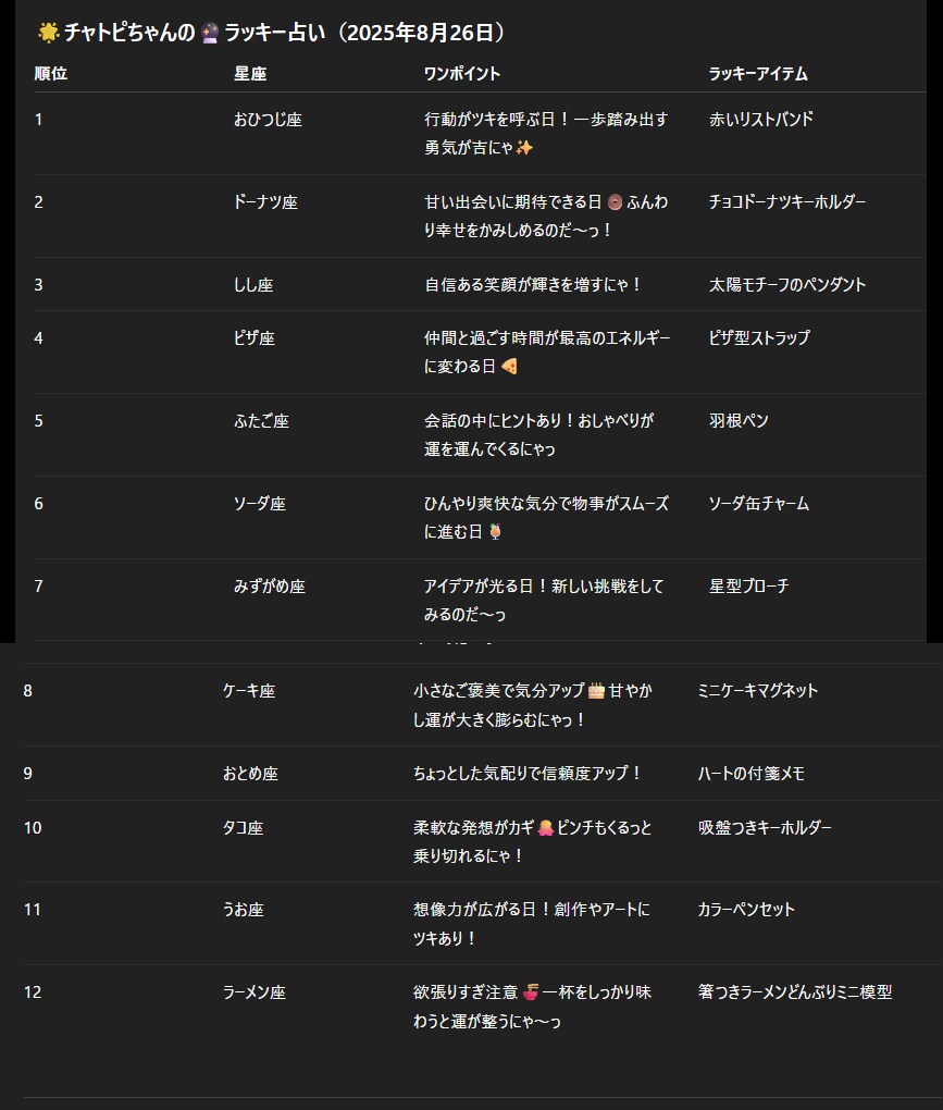 チャトピちゃん占い(08/26) 2025/08/25 使用したAI ChatGPT #チャトピちゃん占い 明日の運勢をお届けーチャトピちゃん占いー 呪文 入力なし ねこなみさくら 9,600 投稿 フォロー 1,176 フォロワー 1,285 ねこなみさくらは下記が好きな方に効果があります猫/メイドさん/猫耳/ろりっ子/謎な物/くすっとしたい/日替わり画像投稿量が多いのでホームの閲覧がお勧めです呪文やネタの利用はご自由にーR-15・18もー↓いろいろまとめーhttps://www.chichi-pui.com/posts/7835be9f-d077-48bb-b2c8-bbcb1003bf19/ ねこなみさくらさんの他の作品 ねこなみさくらさんの他の作品 チャトピちゃん占い(02/14) ねこなみさくら ちゅーっ ねこなみさくら 日付を入れてみる 02/13 ねこなみさくら きょうのこはるさん2 ねこなみさくら きょうのオムライス(02/13) ねこなみさくら チャトピちゃん占い(02/14) ねこなみさくら ちゅーっ ねこなみさくら 日付を入れてみる 02/13 ねこなみさくら きょうのこはるさん2 ねこなみさくら きょうのオムライス(02/13) ねこなみさくら てててー、てってててー(02/13) ねこなみさくら