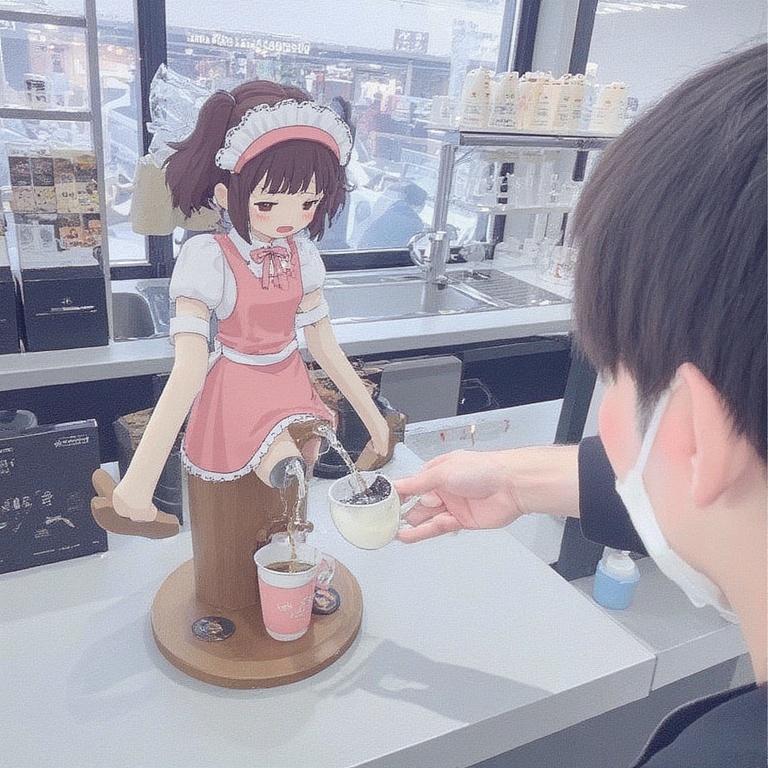 ドリンクサーバーの表にメイドさんが描かれていて、その股間下の注ぎ口にカップを置いて(小便のように)注ぐサーバーです