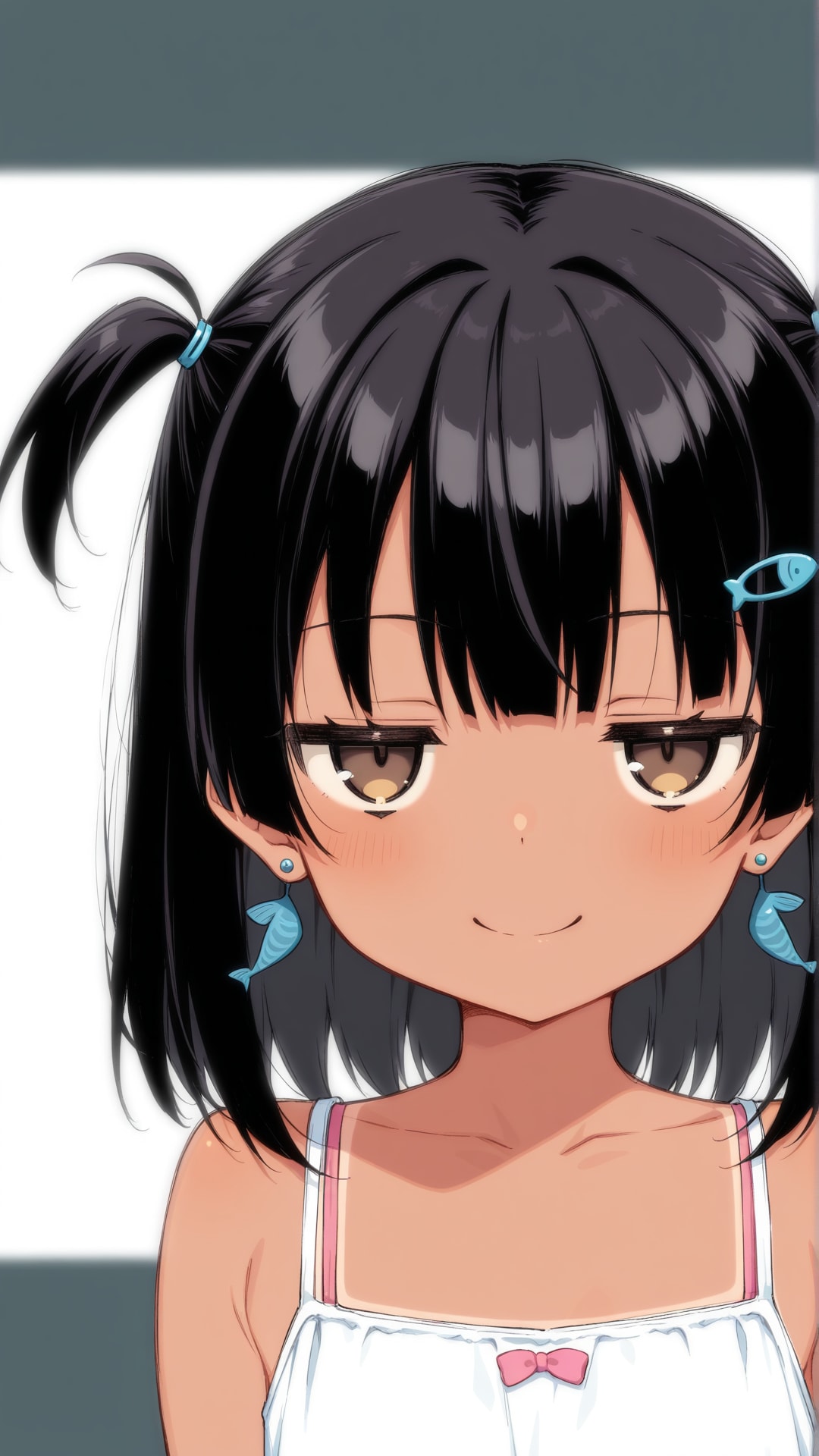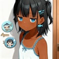 日焼けをした黒髪ツーサイドアップの髪型で青い目の女の子とマグロと月をモチーフにしたエンブレム デフォルメされていて可愛い "Aguro"の刻印