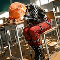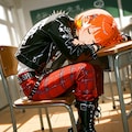 jacket partially removed, heart in eye, burnt clothes, holding fishing rod, kanji, doujin cover, pentagram, tape gag, adjusting headwear, red socks, friends, cloud print, coke-bottle glasses, oral invitation, competition school swimsuit, barbell piercing, gradient legwear, prisoner, blood on breasts, wind chime, carrying over shoulder, tape measure, flaming weapon