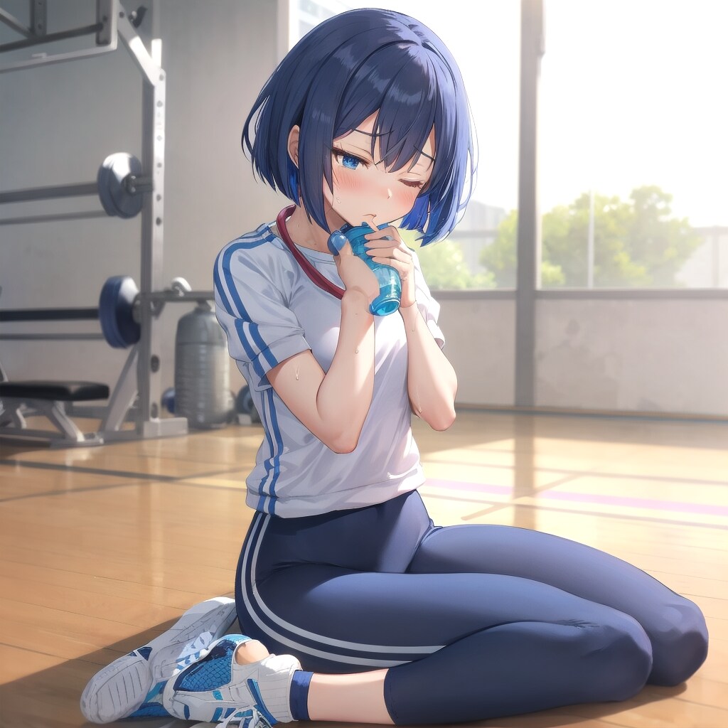 部活動の後、体育館の床に座って休憩する青髪ボブ子ちゃん。ジャージの上着を軽く羽織り、汗がうっすら浮かぶ額。ジト目でこちらを見ながらも、実は試合を応援してくれたことに対して感謝しているような表情。