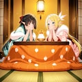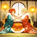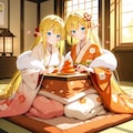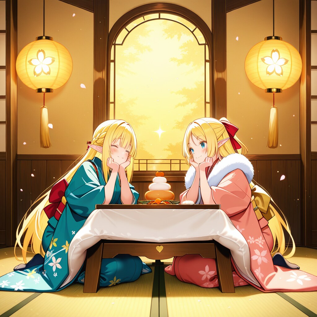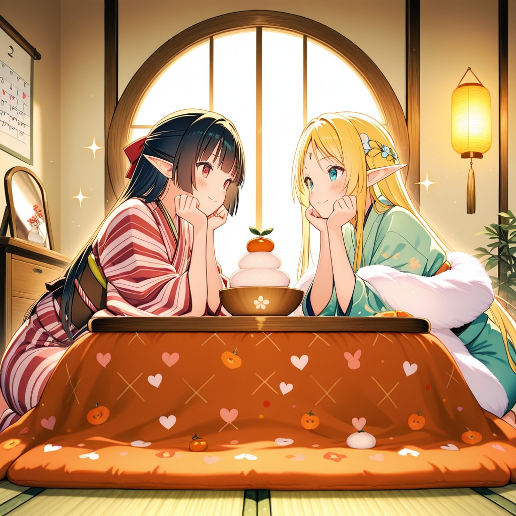 お正月の鏡餅を飾ったり眺めたりしているエルフの女の子