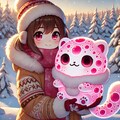 暖かく包み込むように「ももほうくん」風のユキヒョウを抱く少女と、雪原の静寂が素敵に描かれていますね。😊🍑