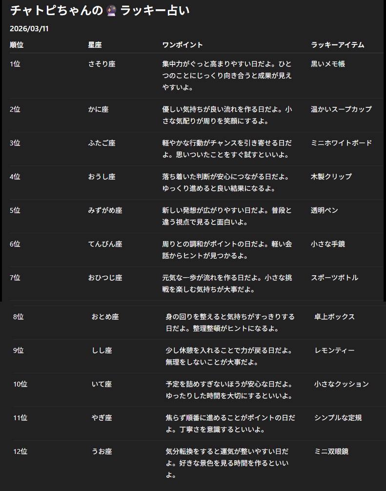 チャトピちゃん占い(03/11) 2026/03/10 使用したAI ChatGPT #チャトピちゃん占い 明日の運勢をお届けーチャトピちゃん占いー 呪文 入力なし ねこなみさくら 10,266 投稿 フォロー 1,254 フォロワー 1,369 ねこなみさくらは下記が好きな方に効果があります猫/メイドさん/猫耳/ろりっ子/謎な物/くすっとしたい/日替わり画像投稿量が多いのでホームの閲覧がお勧めです呪文やネタの利用はご自由にーR-15・18もー↓いろいろまとめーhttps://www.chichi-pui.com/posts/7835be9f-d077-48bb-b2c8-bbcb1003bf19/ ねこなみさくらさんの他の作品 ねこなみさくらさんの他の作品 チャトピちゃん占い(04/18) ねこなみさくら きょうのオムライス(04/17) ねこなみさくら きょうのアドバイス ねこなみさくら きょうの取引(04/17) ねこなみさくら てててー、てってててー(04/17) ねこなみさくら チャトピちゃん占い(04/18) ねこなみさくら きょうのオムライス(04/17) ねこなみさくら きょうのアドバイス ねこなみさくら きょうの取引(04/17) ねこなみさくら てててー、てってててー(04/17) ねこなみさくら 04/13でチャトピちゃん占い1周年だったー ねこなみさくら