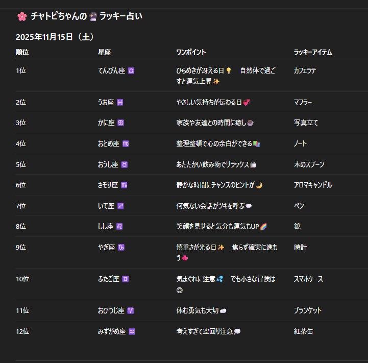 チャトピちゃん占い(11/15) 2025/11/14 使用したAI ChatGPT #チャトピちゃん占い 明日の運勢をお届けーチャトピちゃん占いー 呪文 入力なし ねこなみさくら 8,695 投稿 フォロー 1,016 フォロワー 1,114 ねこなみさくらは下記が好きな方に効果があります猫/メイドさん/猫耳/ろりっ子/謎な物/くすっとしたい/日替わり画像投稿量が多いのでホームの閲覧がお勧めです呪文やネタの利用はご自由にーR-15・18もー生成用?自作診断メーカーまとめhttps://www.chichi-pui.com/posts/824ee8bb-e261-4f91-bb51-afb6142bc12b/ ねこなみさくらさんの他の作品 ねこなみさくらさんの他の作品 日付を入れてみる 12/07 ねこなみさくら 気がついたら ねこなみさくら 医者の宣言 ねこなみさくら 投稿企画[時代劇] ねこなみさくら てててー、てってててー(12/07) ねこなみさくら 日付を入れてみる 12/07 ねこなみさくら 気がついたら ねこなみさくら 医者の宣言 ねこなみさくら 投稿企画[時代劇] ねこなみさくら てててー、てってててー(12/07) ねこなみさくら チャトピちゃん占い(12/07) ねこなみさくら