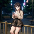 真剣な表情でスマホを両手でいじっているポーズにして。靴は黒の編み上げブーツで厚底にして。