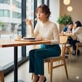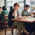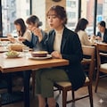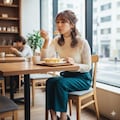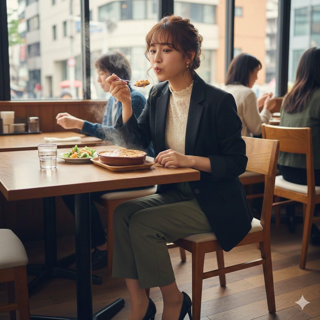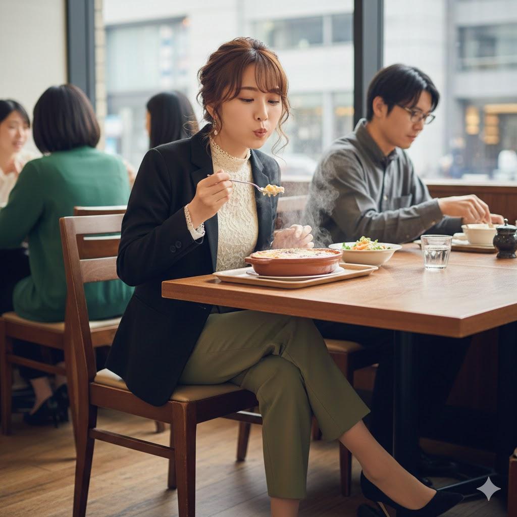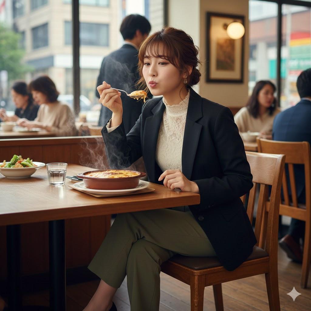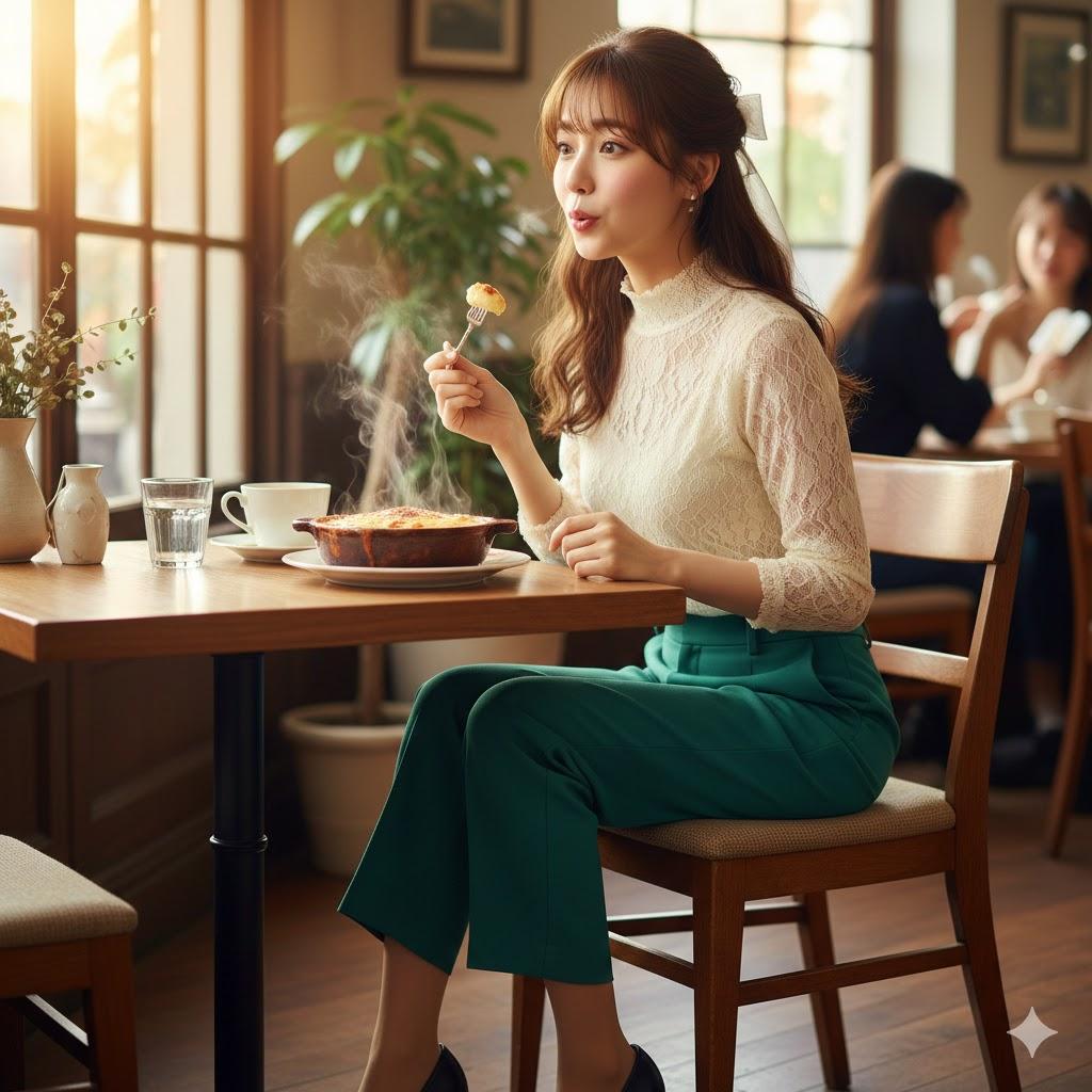 あつあつのグラタンをふーふーしてる仕草が可愛らしい女性を作ってみましたよ。