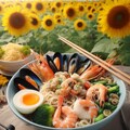 ひまわり畑で食べるseafood noodle