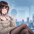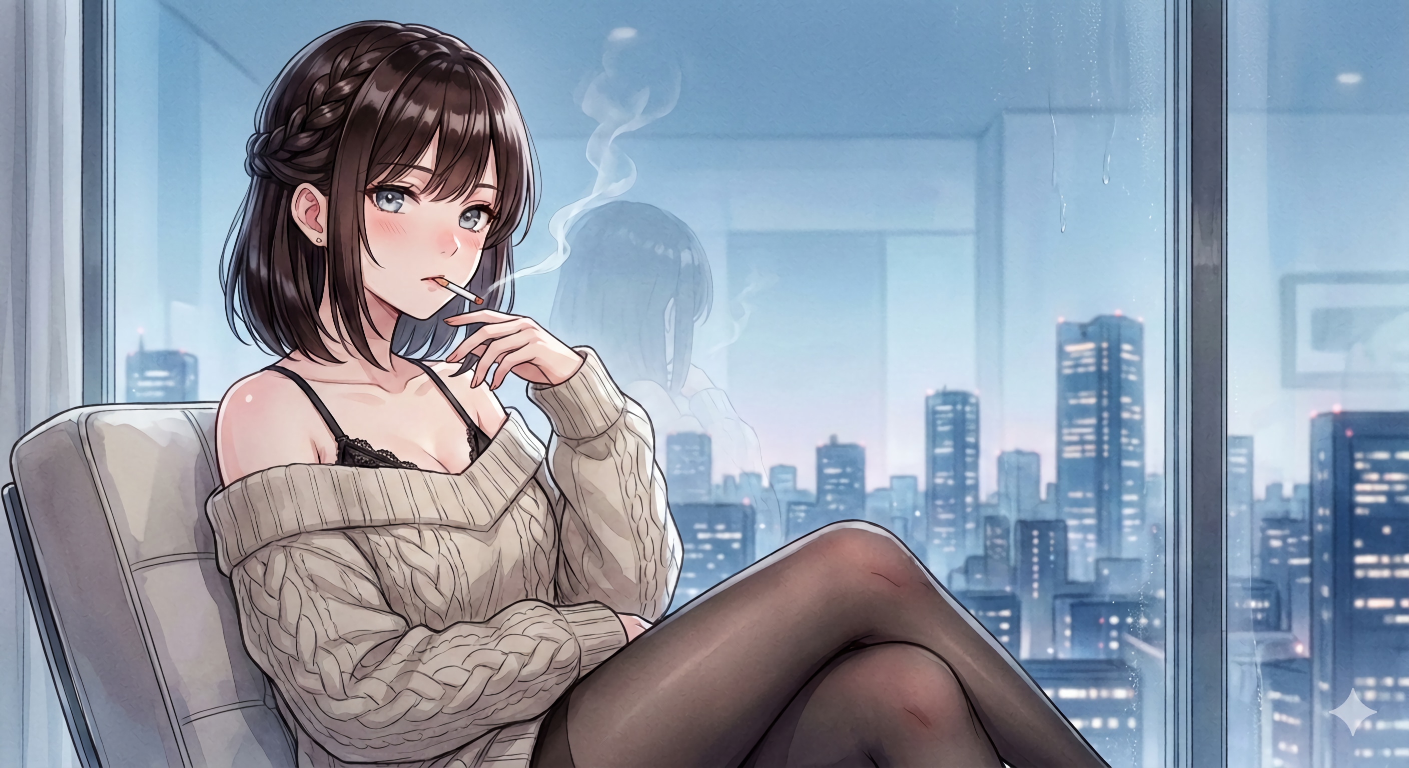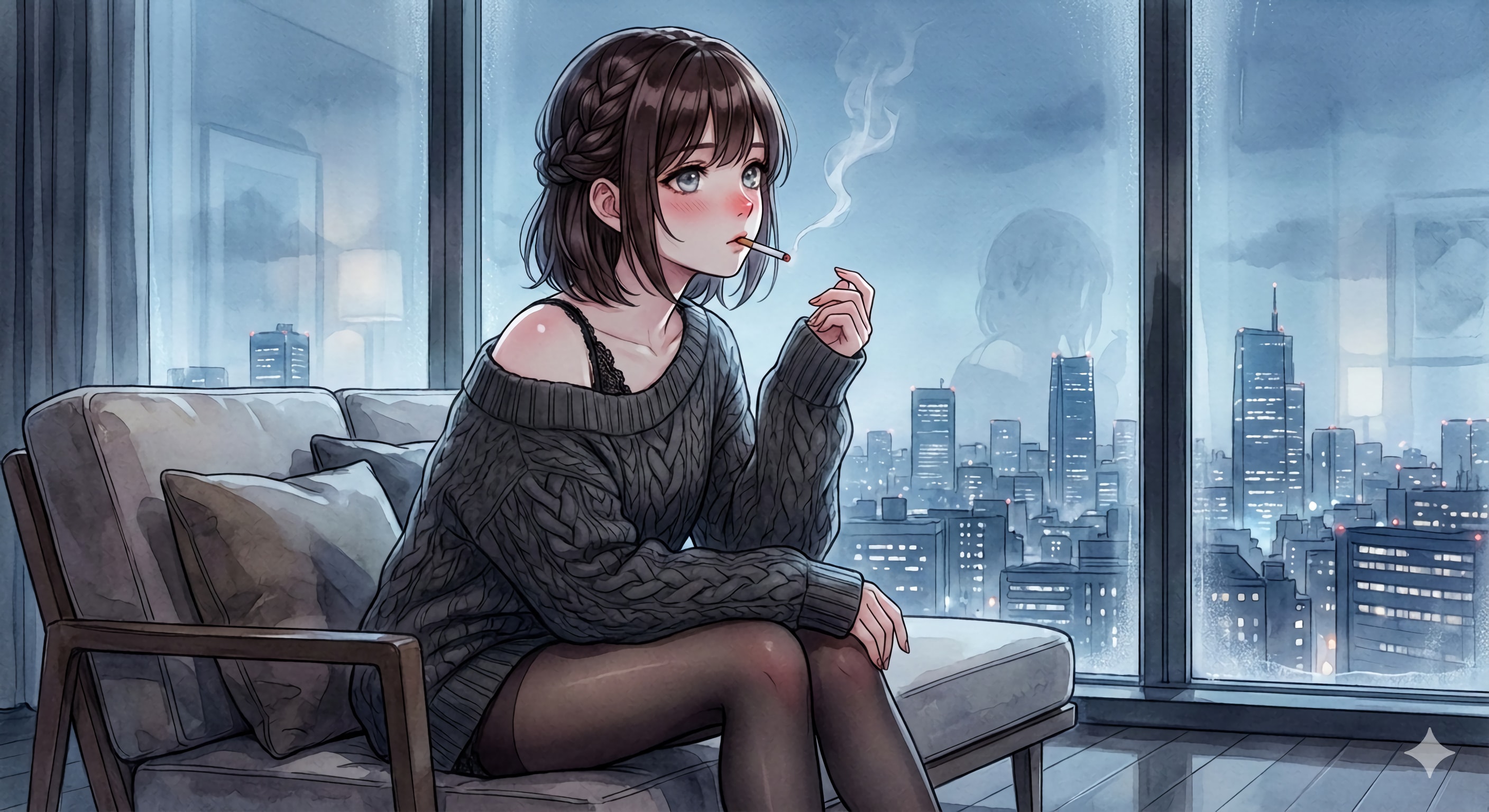 ビルの明かりで雰囲気を彩り、室内の落ち着いた色合いを水彩で装飾しました。