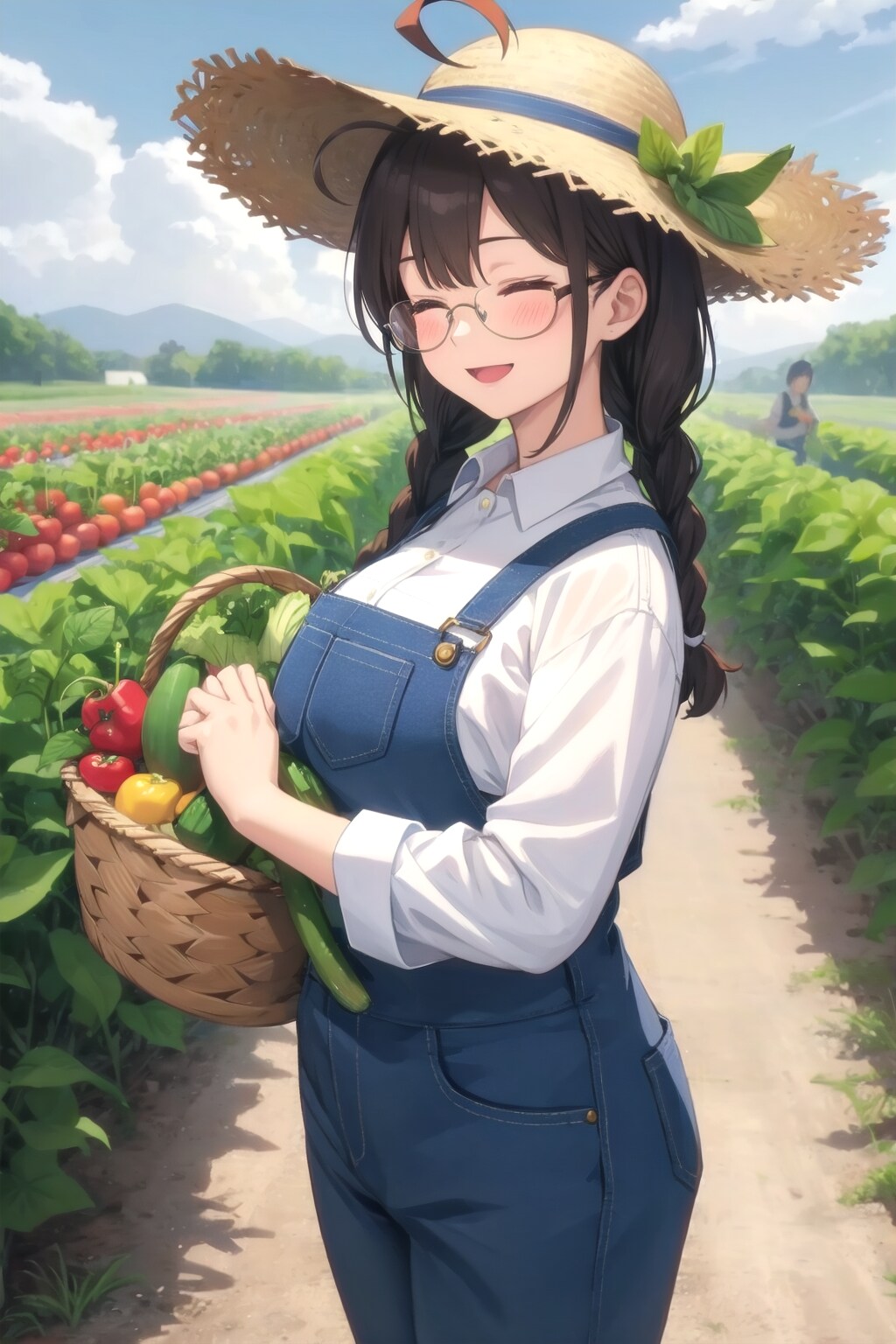 野菜畑をそのまま訳した時(vegetable garden)、6、7枚目のように花壇みたいになっちゃうので「farm(農園)」で生成しました。もうちょっと野菜をおいしそうに作りたいかなあ。作物を絞ればいけるかな。