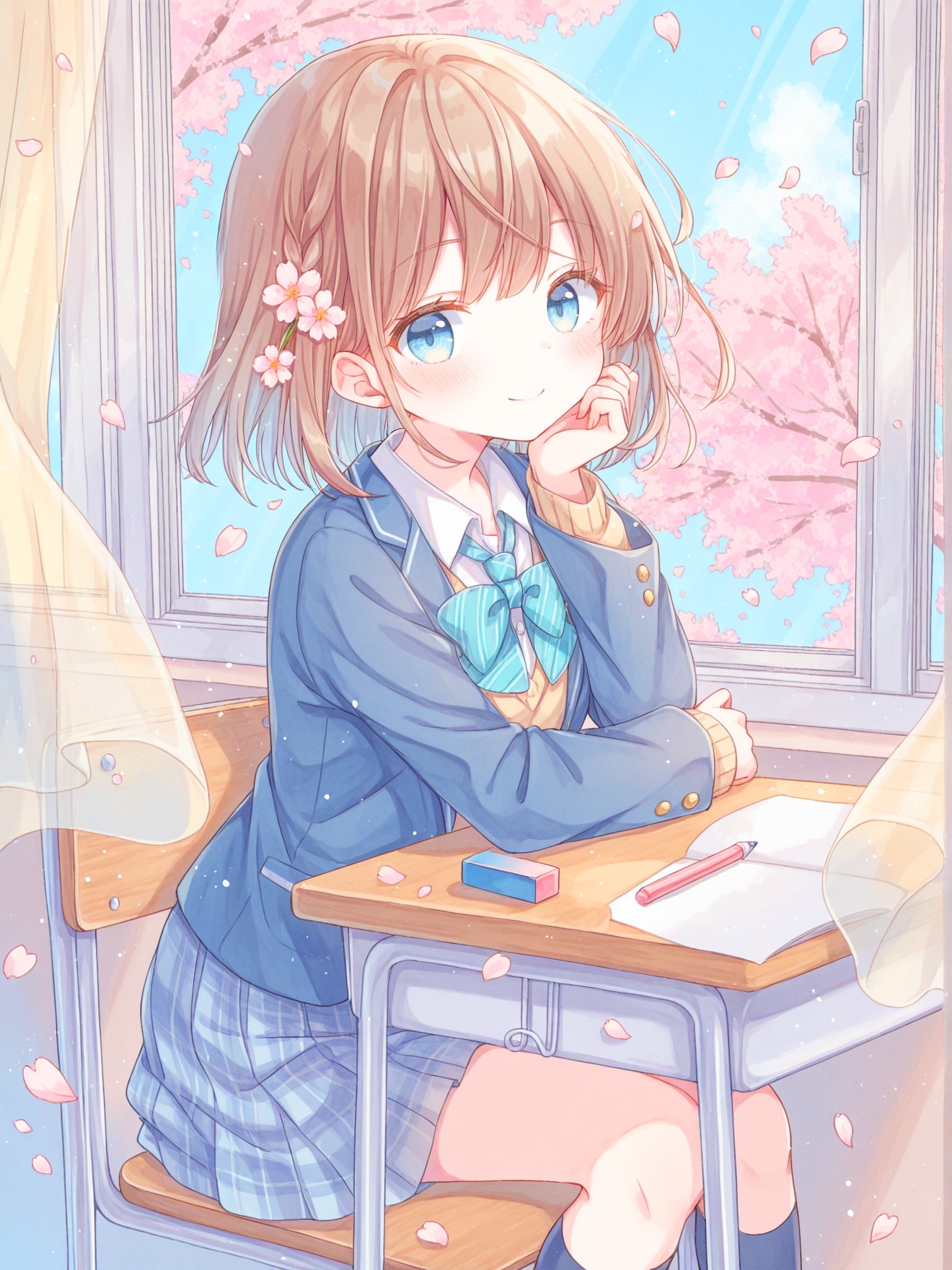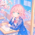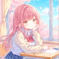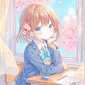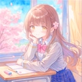 教室の窓から見える桜の花とこちらを見る隣の席の女の子を作ってみました