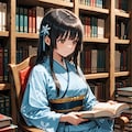 5・6枚目は案内役を務めるしおりさんがサボりで本を読んでる時と同じような雑然とした整理されてない本が積み上げられているような状況で椅子に座って本を読んでる天音さんで。本を読むのは好きそうなイメージなので、こちらのシチュエーションを作りたくて図書館を舞台にしたところはありますね。7・8枚目の外部生成も同じ状況での生成でした。