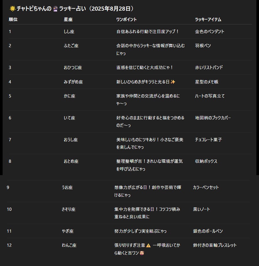 チャトピちゃん占い(08/28) 2025/08/27 使用したAI ChatGPT #チャトピちゃん占い 明日の運勢をお届けーチャトピちゃん占いー 呪文 入力なし ねこなみさくら 9,600 投稿 フォロー 1,176 フォロワー 1,285 ねこなみさくらは下記が好きな方に効果があります猫/メイドさん/猫耳/ろりっ子/謎な物/くすっとしたい/日替わり画像投稿量が多いのでホームの閲覧がお勧めです呪文やネタの利用はご自由にーR-15・18もー↓いろいろまとめーhttps://www.chichi-pui.com/posts/7835be9f-d077-48bb-b2c8-bbcb1003bf19/ ねこなみさくらさんの他の作品 ねこなみさくらさんの他の作品 チャトピちゃん占い(02/14) ねこなみさくら ちゅーっ ねこなみさくら 日付を入れてみる 02/13 ねこなみさくら きょうのこはるさん2 ねこなみさくら きょうのオムライス(02/13) ねこなみさくら チャトピちゃん占い(02/14) ねこなみさくら ちゅーっ ねこなみさくら 日付を入れてみる 02/13 ねこなみさくら きょうのこはるさん2 ねこなみさくら きょうのオムライス(02/13) ねこなみさくら てててー、てってててー(02/13) ねこなみさくら