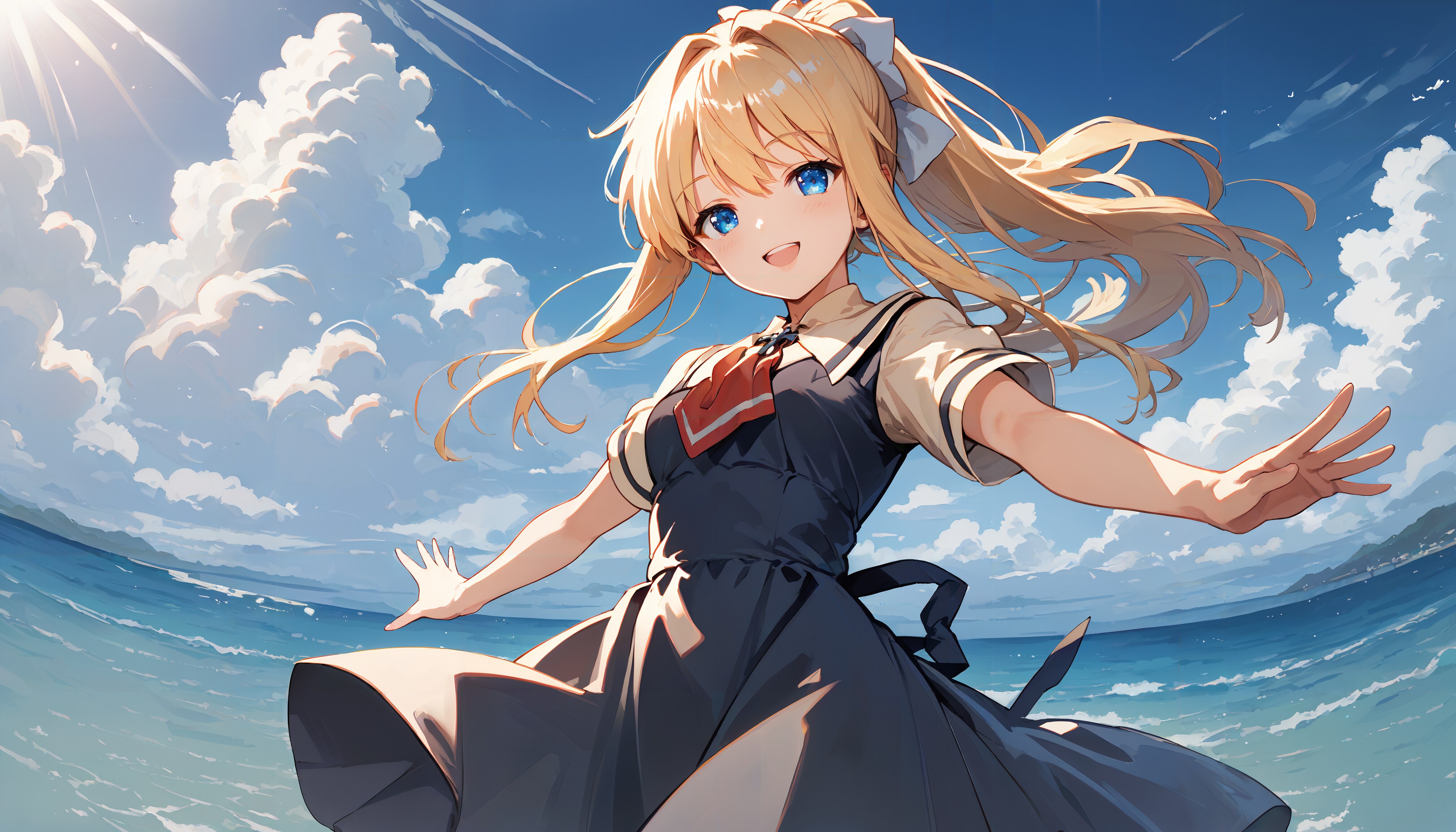 海をバックに腕を広げるCGが印象的だったので、そのイメージで生成しました。