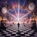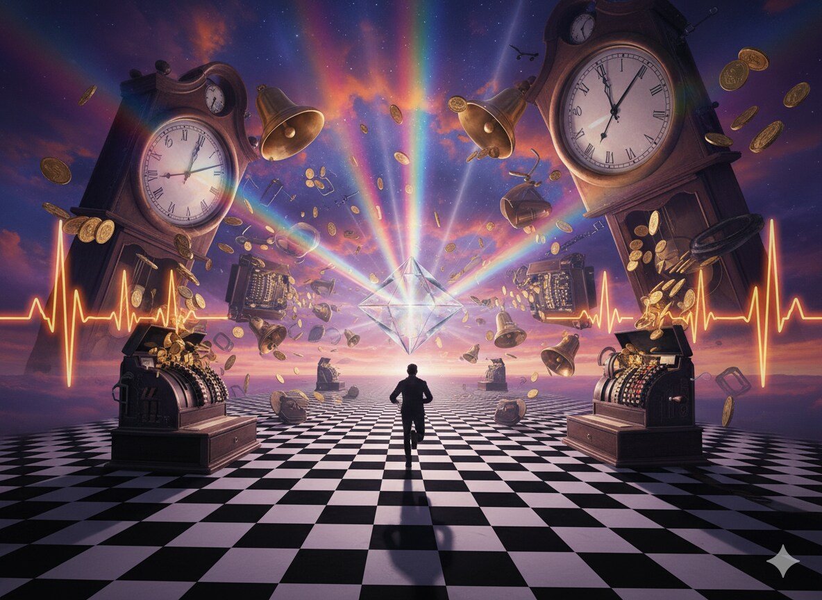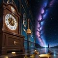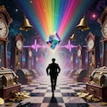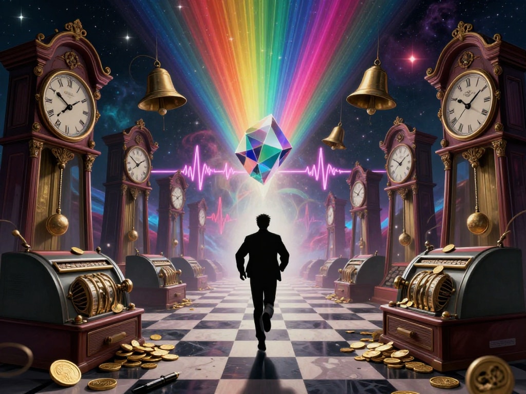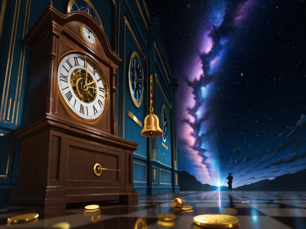 Masterpiece, Best Quality, Amazing Quality, Very Aesthetic, High Resolution, Ultra-Detailed, Absurdres, Newest, Scenery, 3D, Rendered, General, no humans, surrealism, dream, psychedelic, dark side of the moon, prism, refraction, rainbow, light beams, triangle, glowing, grandfather clock, antique clock, pendulum, floating objects, bell, school bell, cash register, gold coins, money, sound waves, heartbeat, rhythm, running, silhouette, distortion, perspective, checkered floor, starry sky, nebula, cosmic, space, time travel, warped, otherworldly, Cinematic_Lighting, BREAK, Depth_of_Field, Volumetric_Lighting,