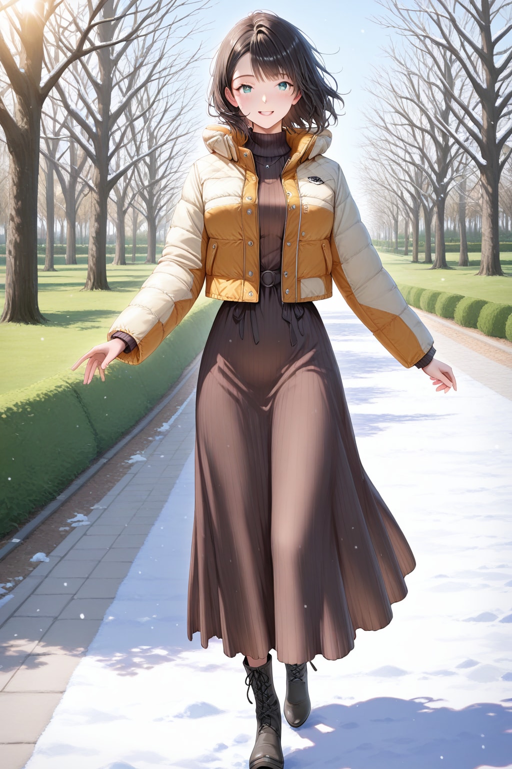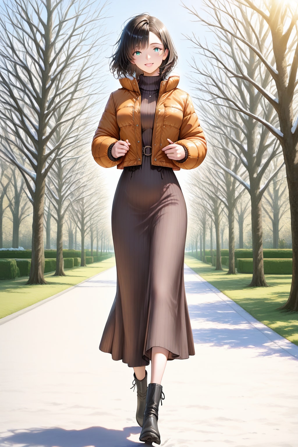ポイント: ダウンで上半身にボリュームを出しつつ、タイトなニットワンピで縦のラインを強調!ショート丈×ロング丈のバランスがスタイル良く見えて、今一番流行ってるよ!