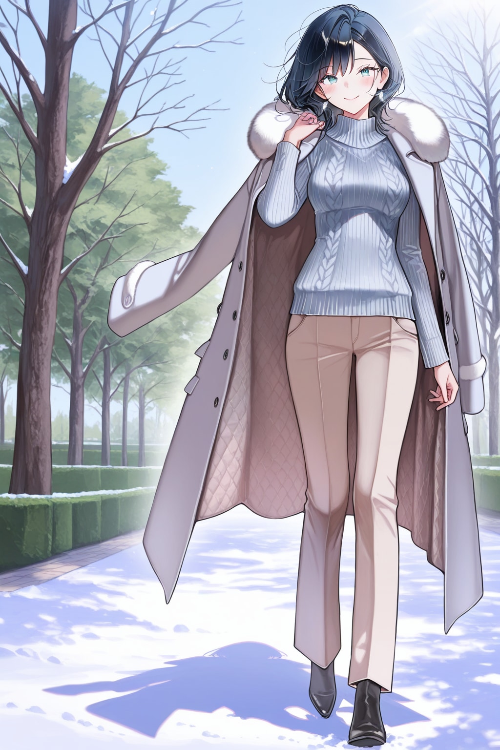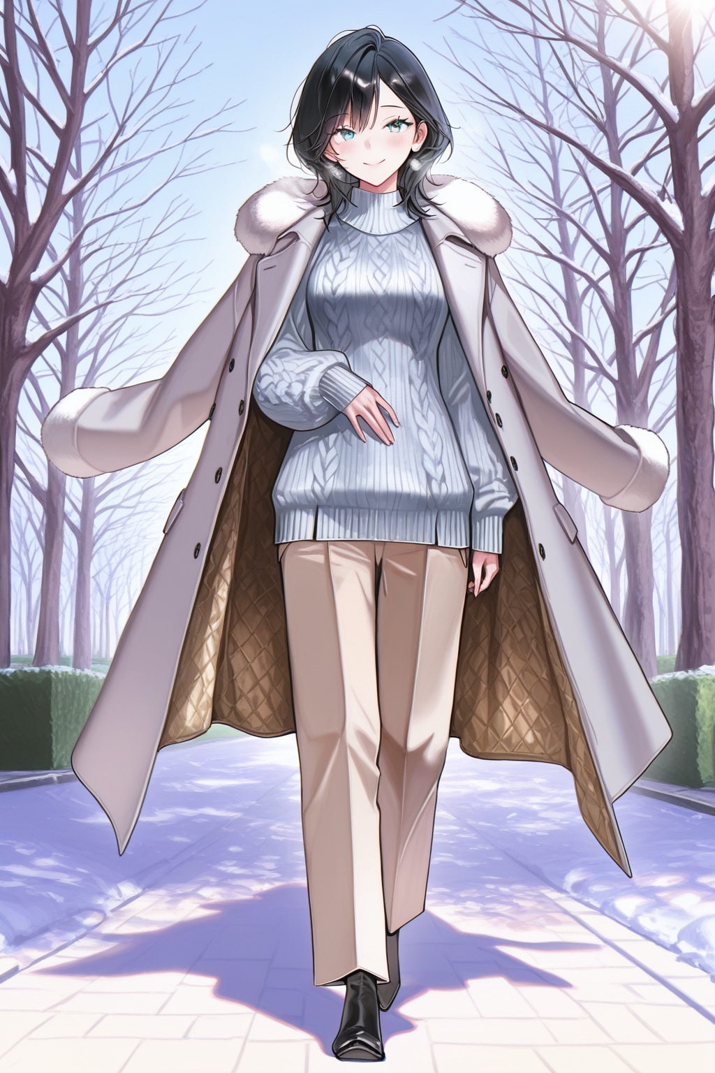 ボトムス: エクリュ(生成り)やベージュのワイドスラックス(ウールや起毛素材だとさらに暖かい!)