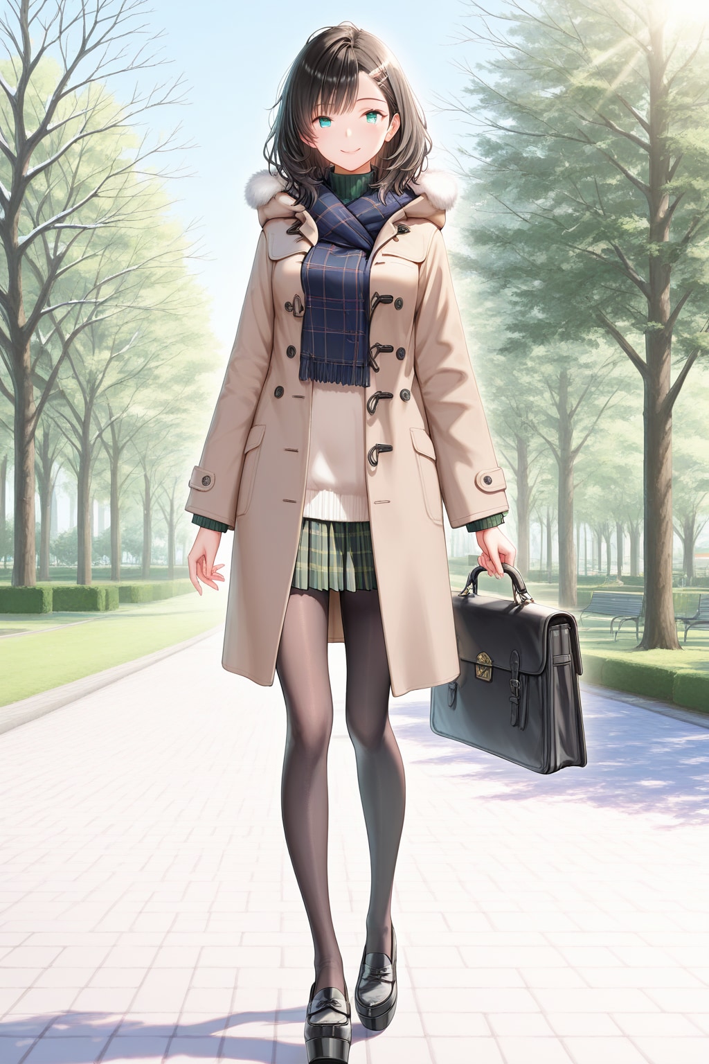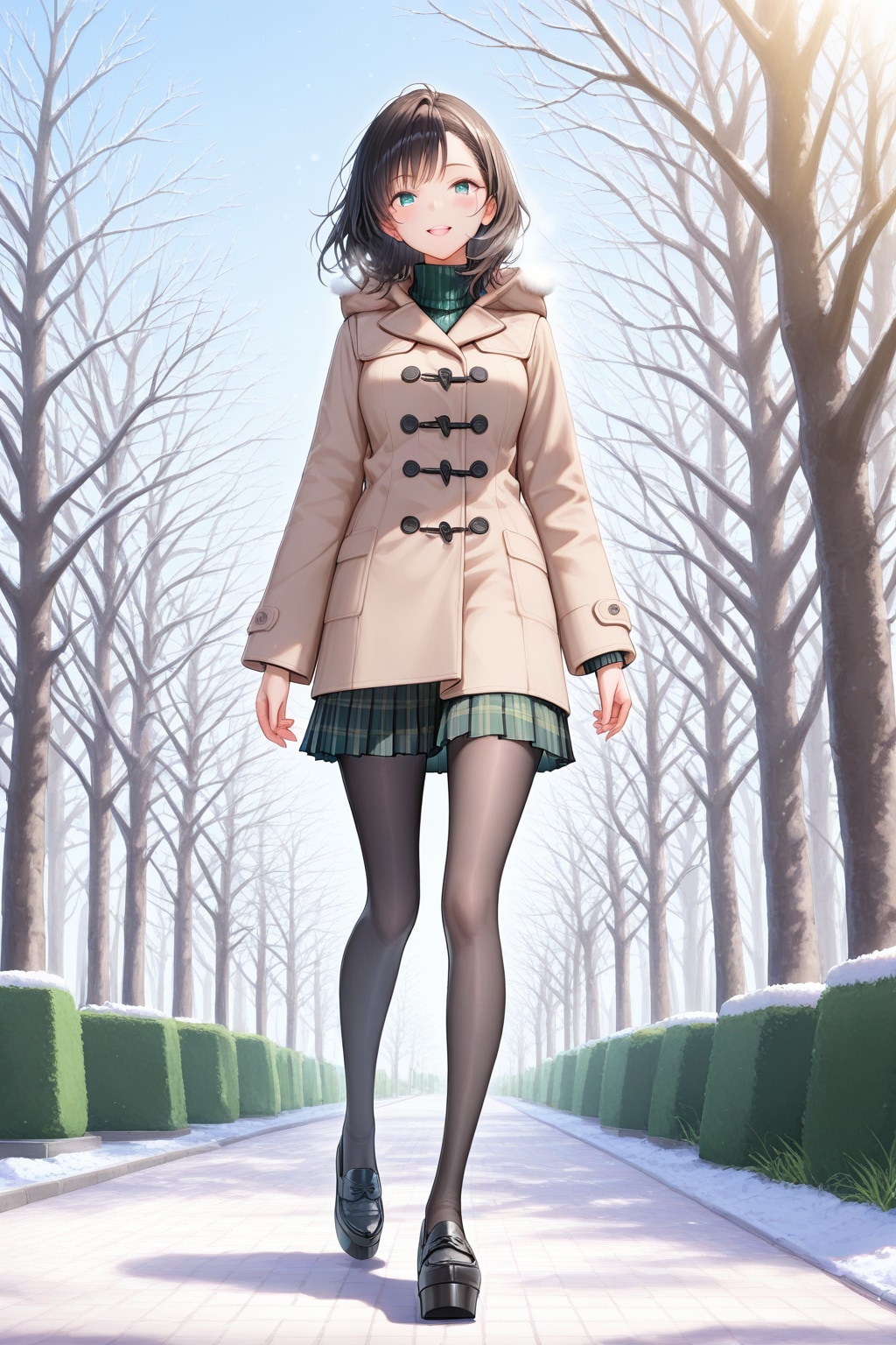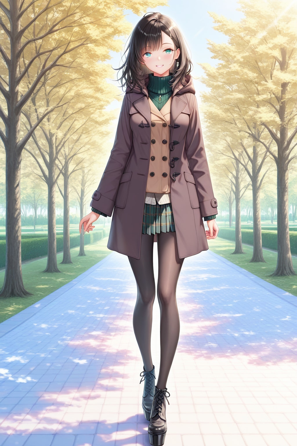 3. 🐻 トラッドに着崩す!「ダッフルコート×チェックプリーツ」