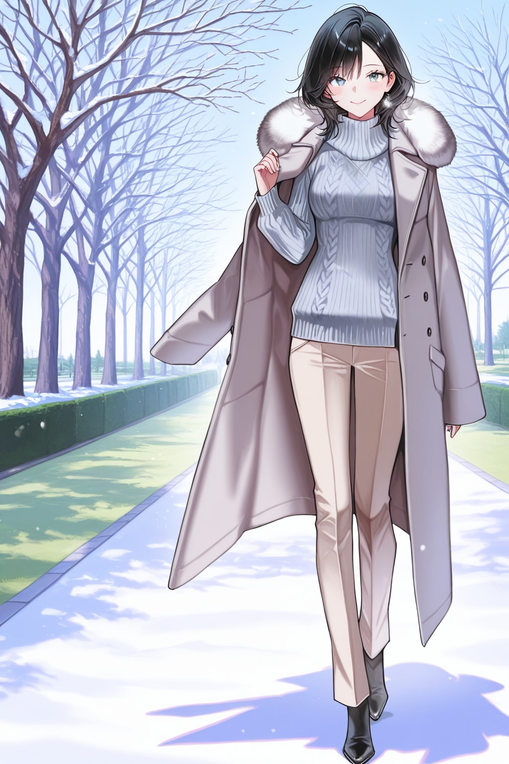 ポイント: モノトーンの延長にある淡いニュアンスカラーで全身をまとめると、一気に上品な雰囲気が出るよ!ふわふわの素材を選ぶことで、冬らしさと暖かさがアップ!