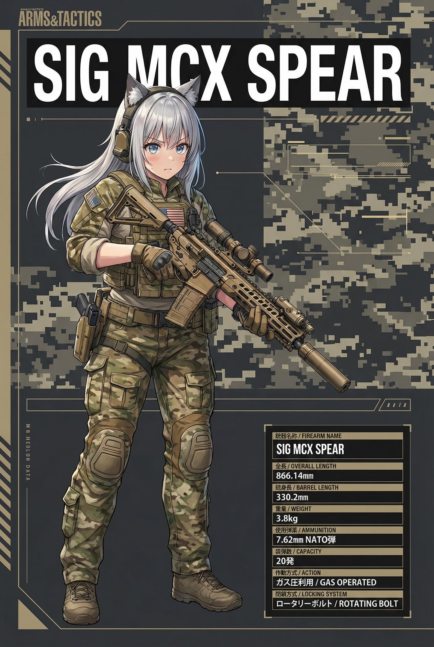 銃器や装備の指定も細かくプロンプトに入れましたが、やっぱり優秀ですね😲「SIG MCX SPEAR」は学習されているようです✨VORTEX社製ショートライフルスコープもイメージ通りです😋ただ一つ惜しいのは、マガジンが7.62㎜サイズではなく5.56㎜サイズに見えることでしょうか💧…まぁ、こんなことはミリタリーガチ勢でもなければ気にもならないでしょうね😝