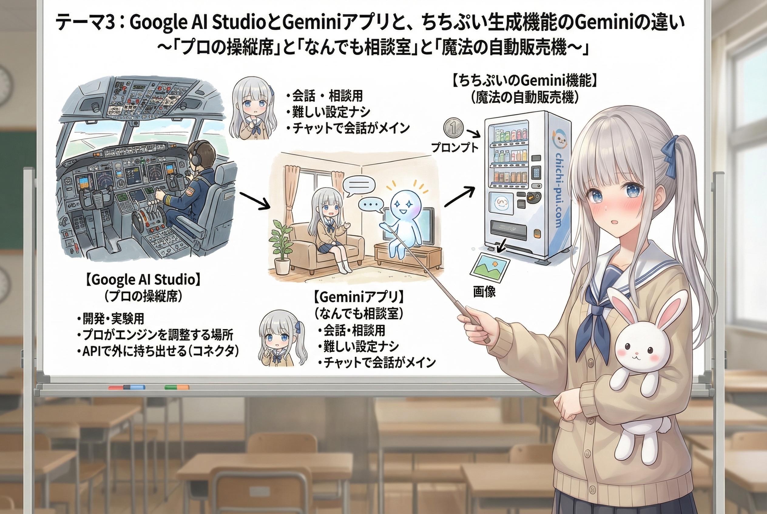 ### 【テーマ3】Google AI StudioとGeminiアプリとちちぷい生成機能のGeminiの違い