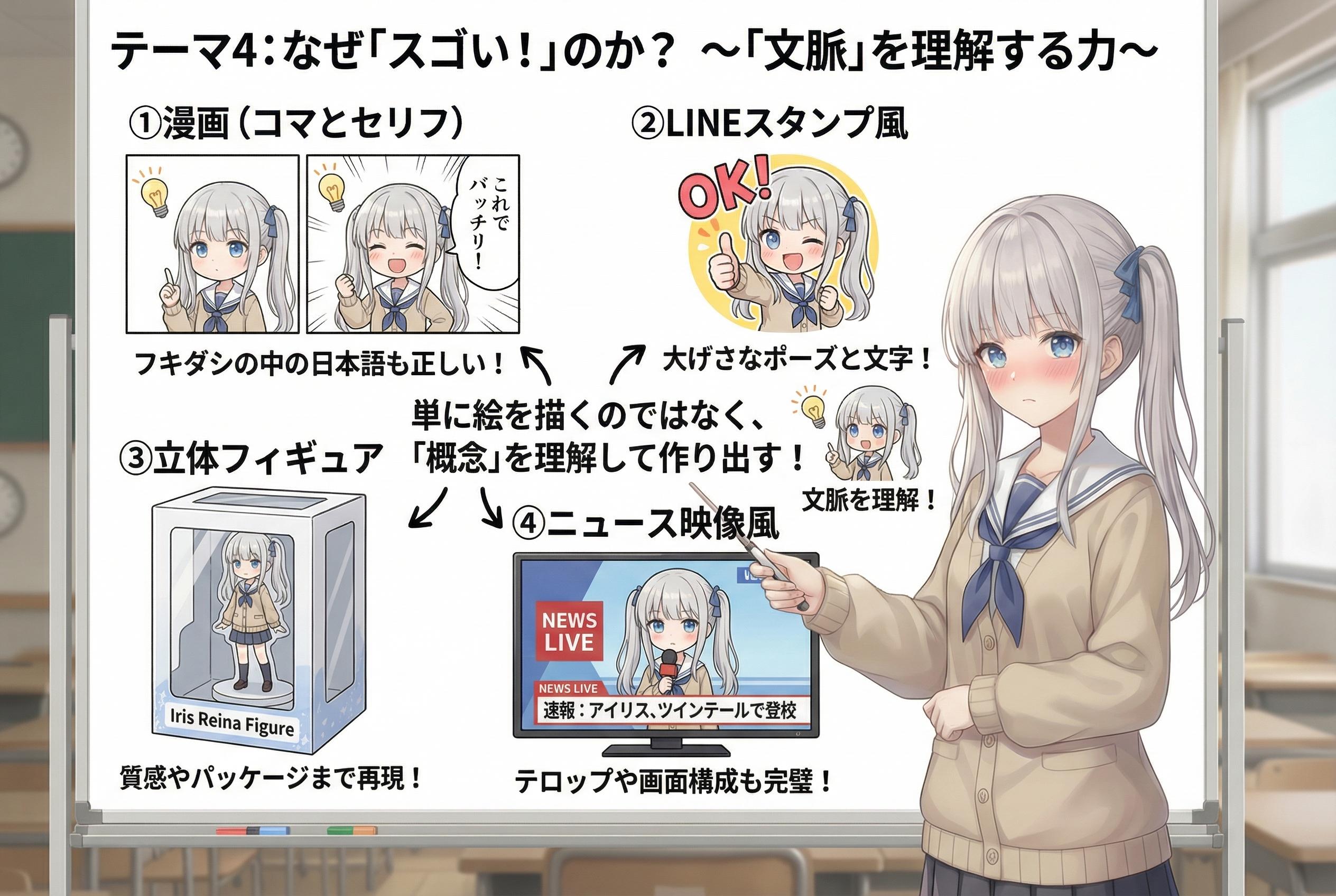絵の美しさだけじゃなくて、「この看板にはこう文字が書かれているべき」「漫画ならここにセリフが入る」「ニュース映像なら下にテロップが出る」っていう、**世の中の構造やルールをめちゃくちゃ賢く理解している**の。