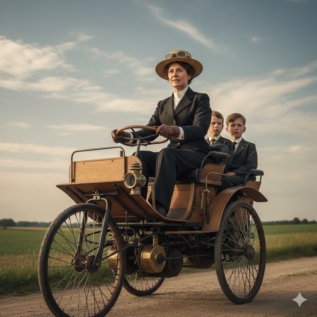 ●状況: 当時のモトールヴァーゲンは2速ギアしかなく、勾配のきつい坂道ではパワー不足で止まってしまいました。そのたびにベルタは息子たちに「降りて押しなさい!」と命じ、自分も泥にまみれて車を押しました。