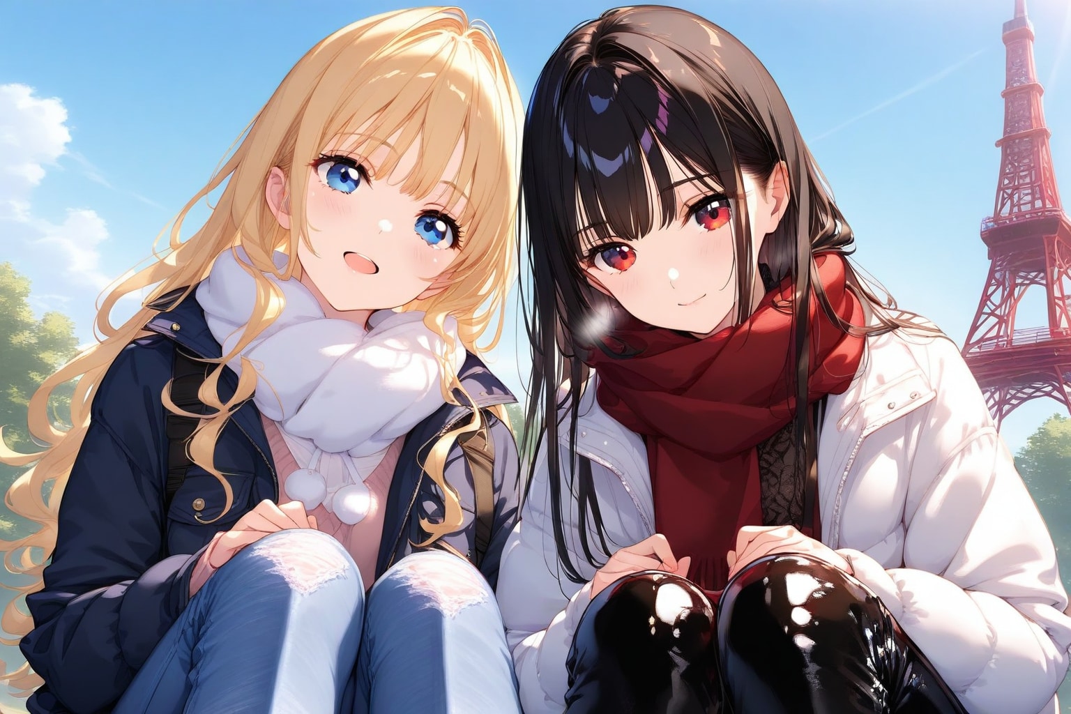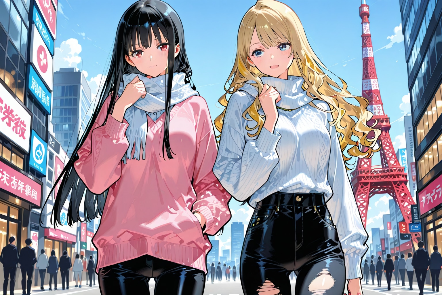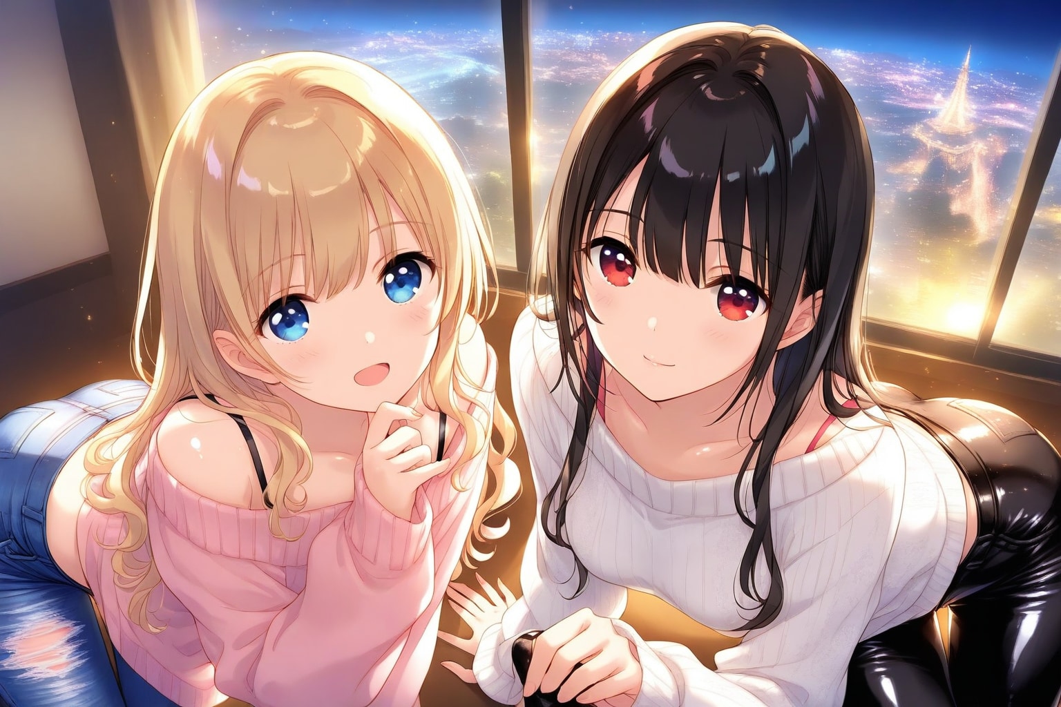 2girls, jeans, leather pants