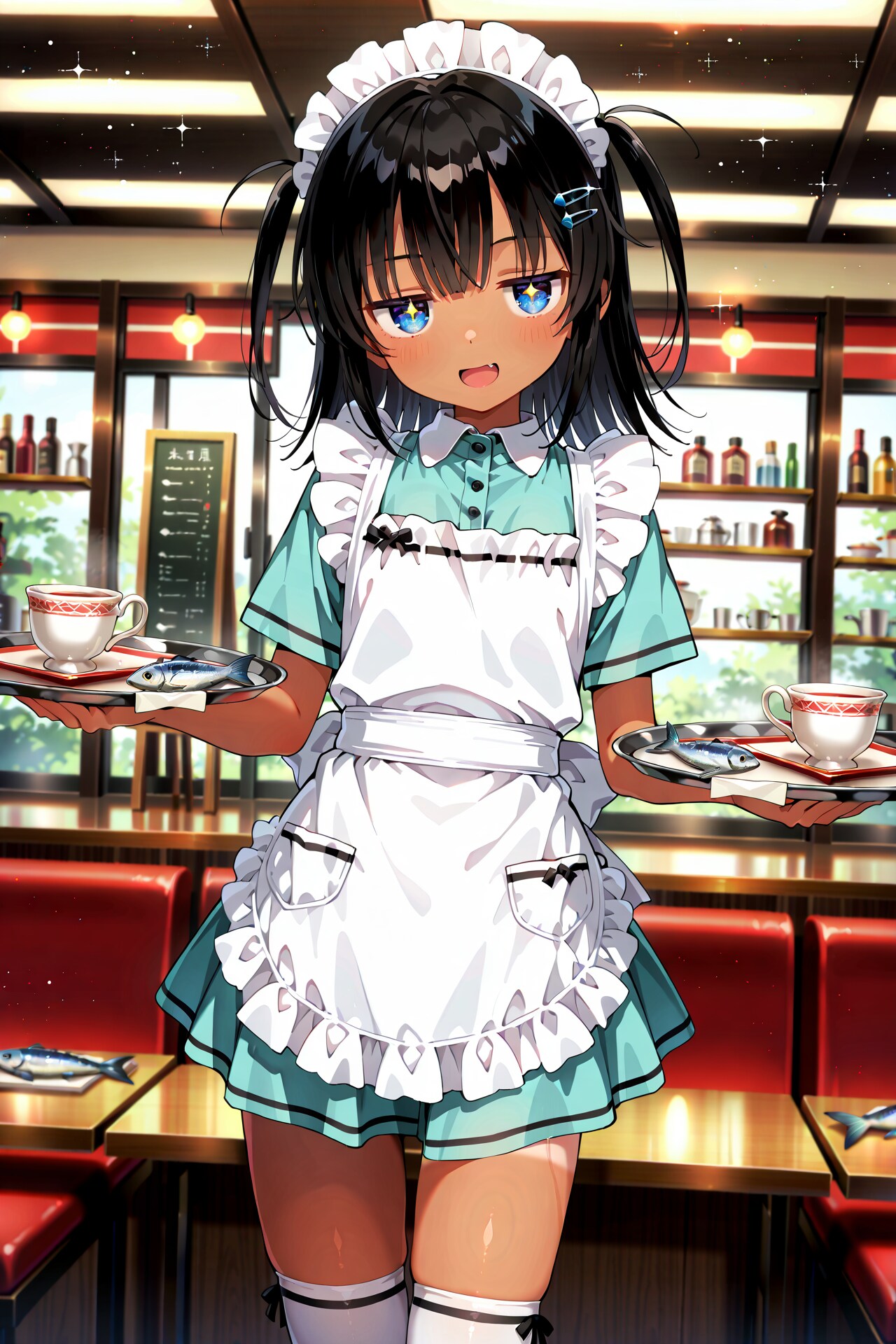 コーヒーや紅茶の注文を受ける際、「魚はお付けしますか?」と聞くこなつちゃん。